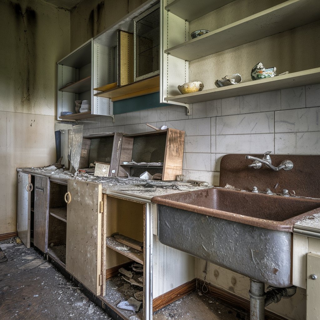 I entered the kitchen first. The furniture was decayed, reduced to fragile remnants of what had once been a lively space. The metal sink was rusted, its edges jagged and corroded. A few chipped bowls were still scattered on the shelves, as though left behind in a hurried departure. On the floor, long, jagged scratches startled me. They looked like something heavy had been dragged across the wooden planks, leaving strange marks behind.