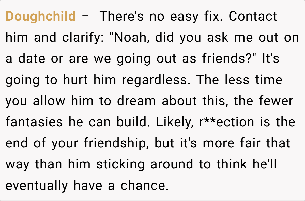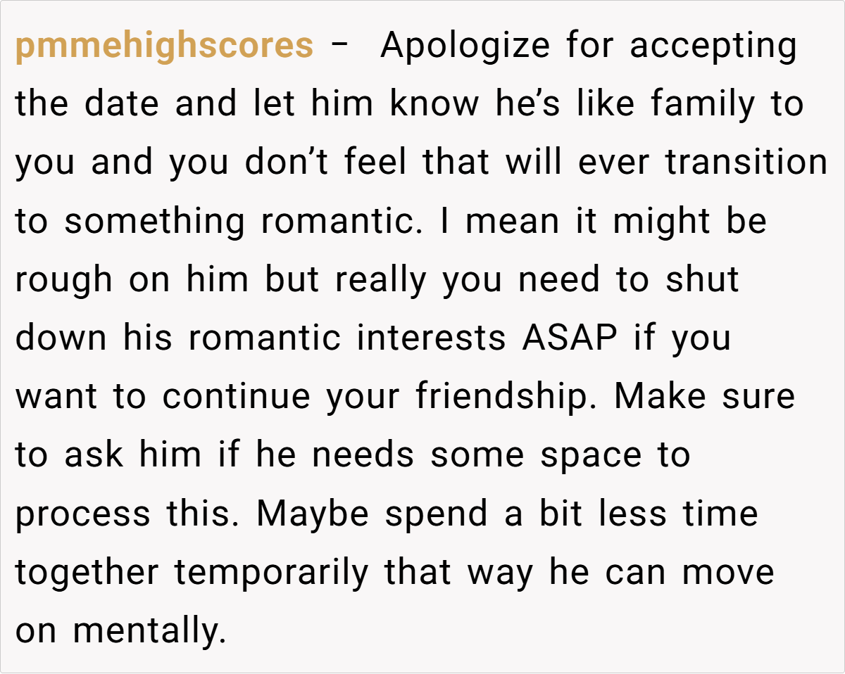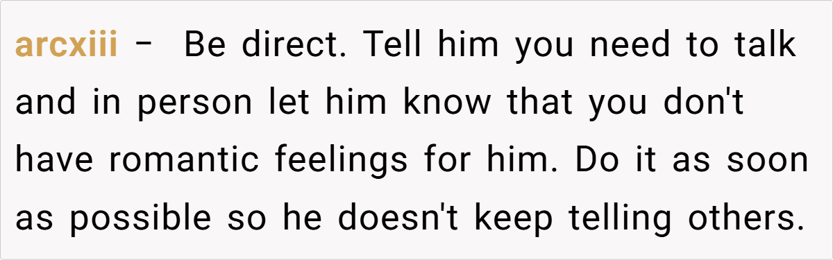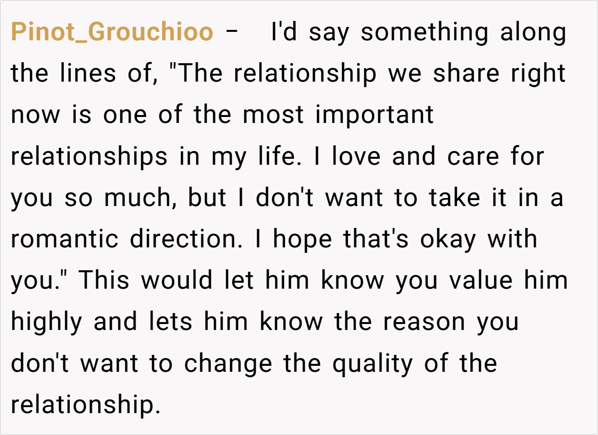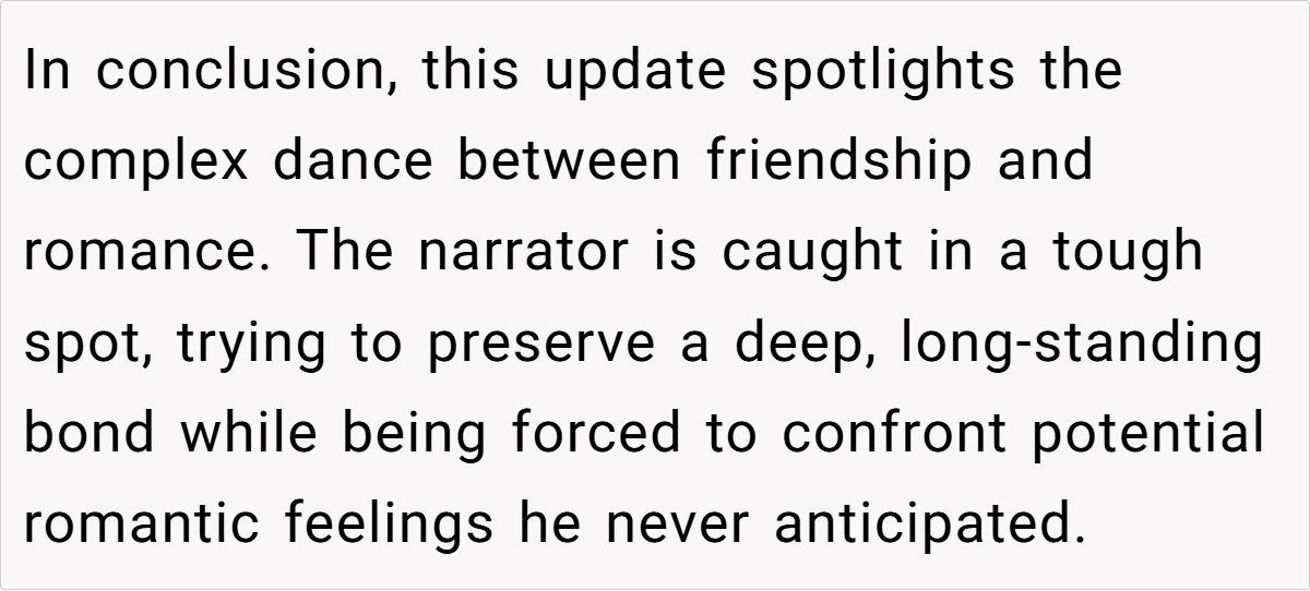 Many redditors empathize with the narrator, saying that if you’re not interested in a romantic relationship, it’s best to gently clarify that you value the friendship too much to risk losing it. Others argue that the best approach is to talk it out honestly, perhaps over coffee, to avoid any misunderstanding. The consensus seems to be that while the situation is awkward, clear communication is the only way to ensure that both parties can move forward—whether as friends or by redefining the relationship.
