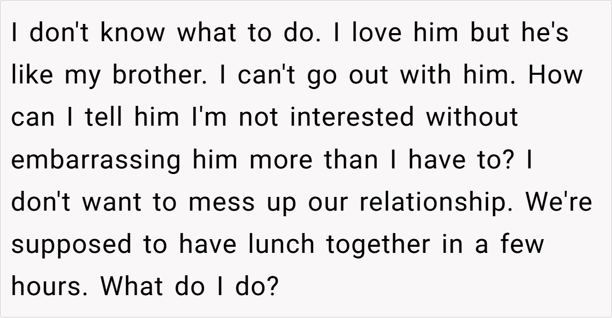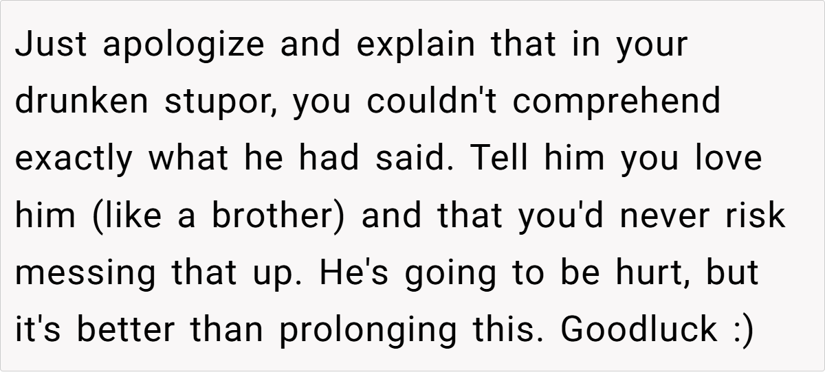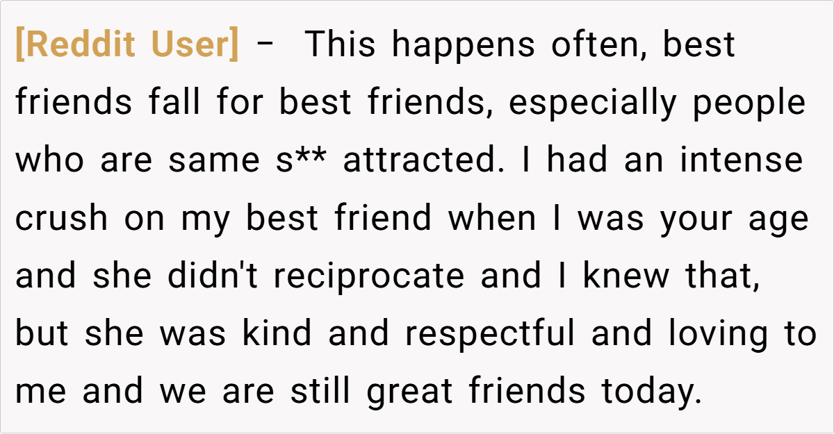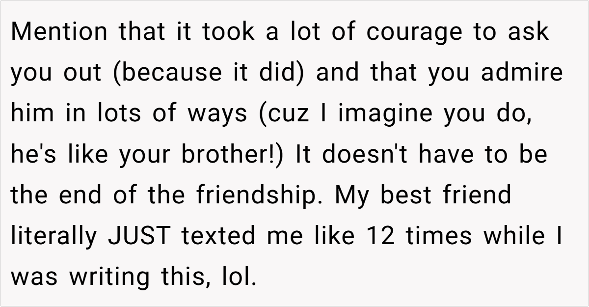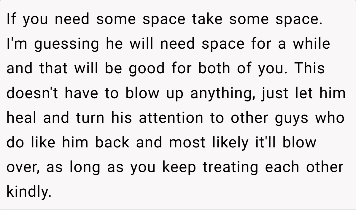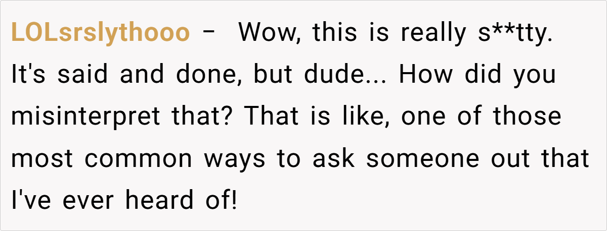 Many redditors empathize with the narrator, saying that if you’re not interested in a romantic relationship, it’s best to gently clarify that you value the friendship too much to risk losing it. Others argue that the best approach is to talk it out honestly, perhaps over coffee, to avoid any misunderstanding. The consensus seems to be that while the situation is awkward, clear communication is the only way to ensure that both parties can move forward—whether as friends or by redefining the relationship.