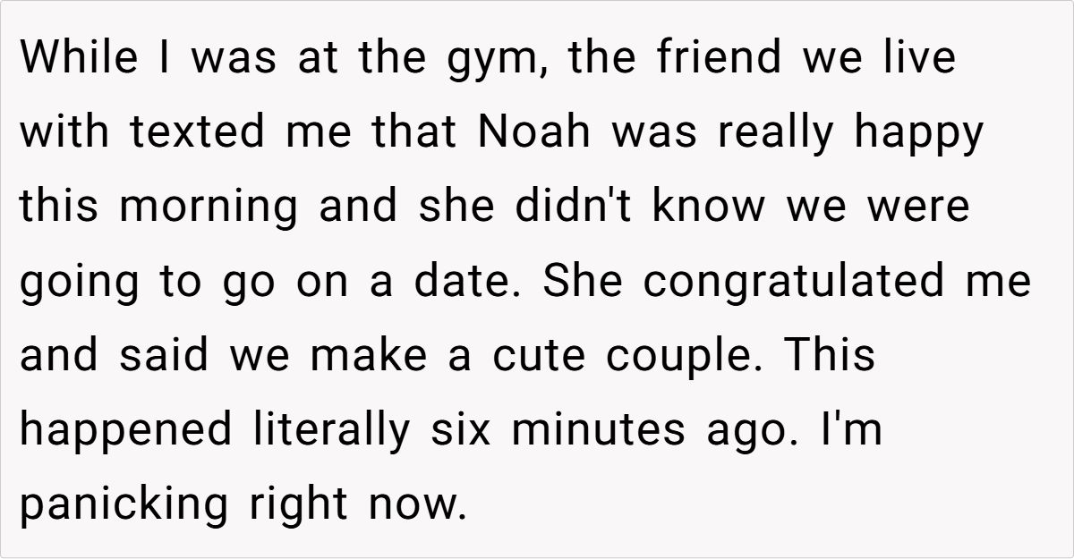Now, with a text from a mutual friend congratulating them as a “cute couple” and a looming lunch appointment, he’s panicking over how to handle his true feelings without hurting Noah or damaging their long-standing bond.