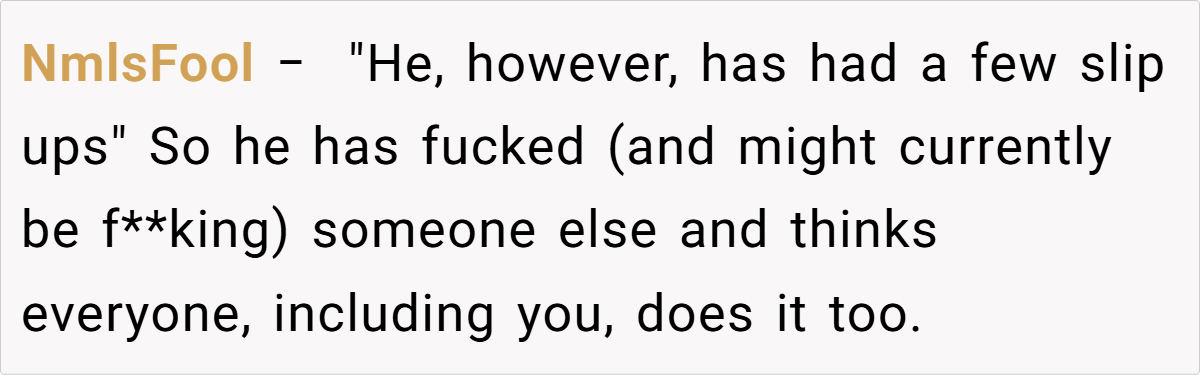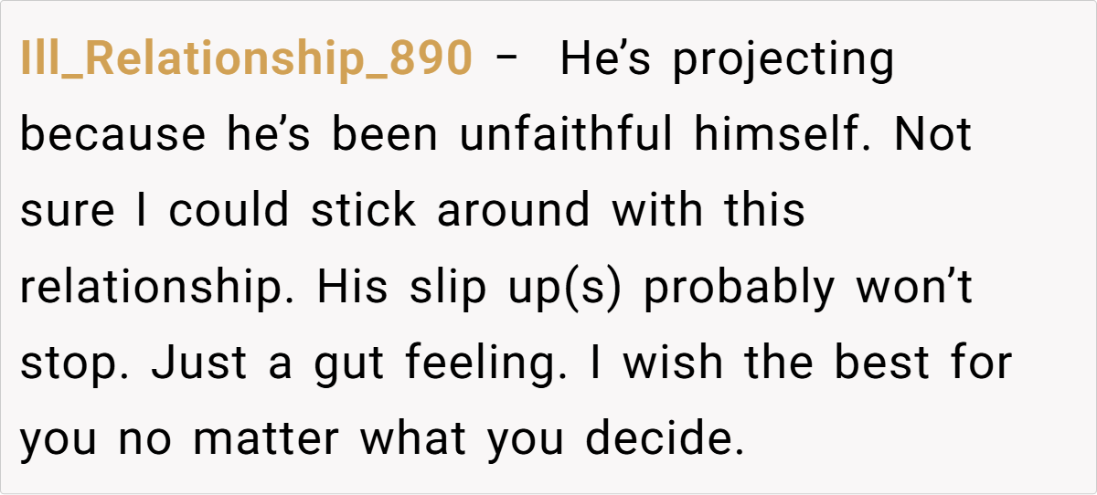 The overwhelming consensus is that this man is projecting his own infidelity onto his partner. Many users pointed out that his previous “slip-ups” should be a much bigger concern than any hypothetical infidelity on her part. Others warned the OP about the risks of staying in a long-term relationship with someone who refuses to fully commit.