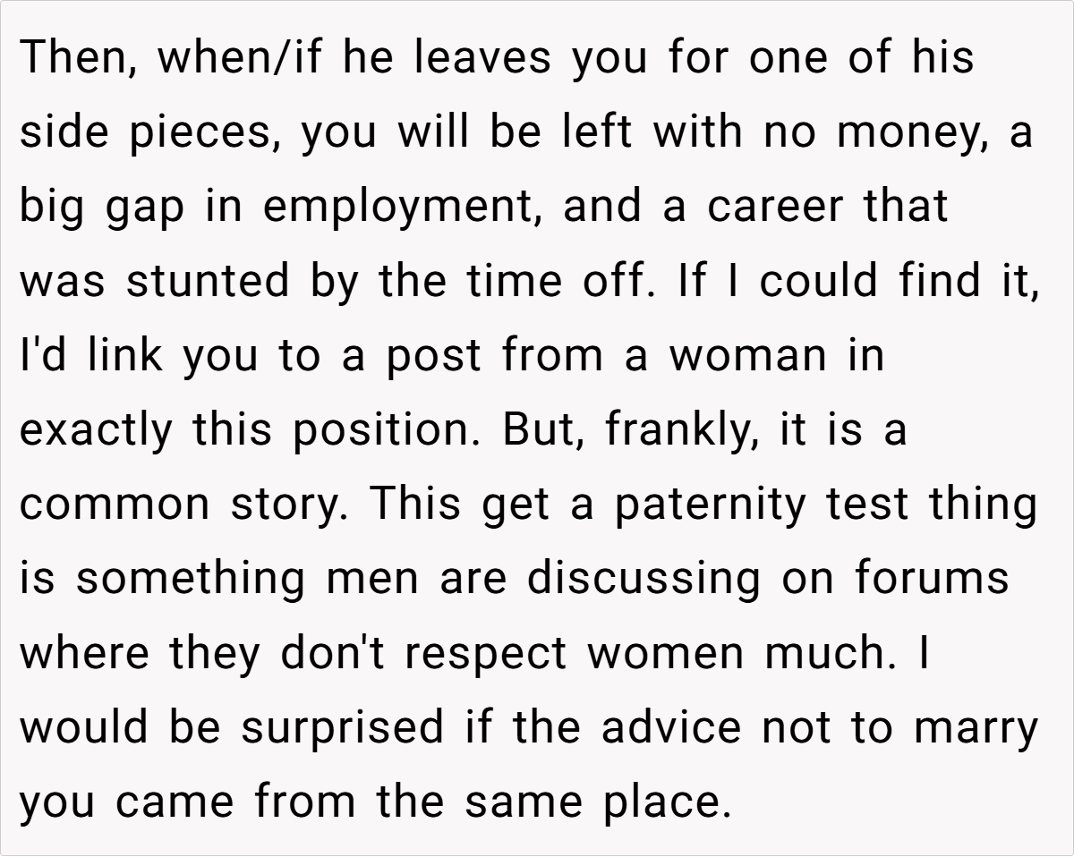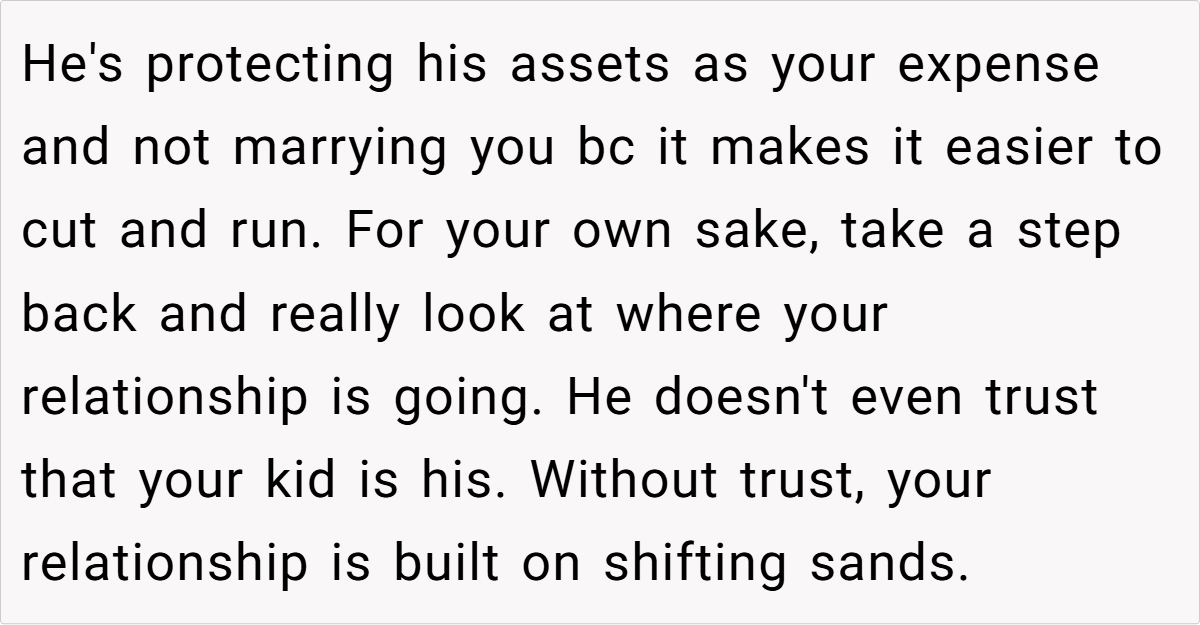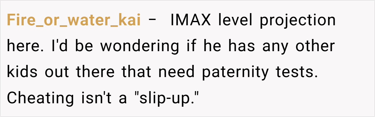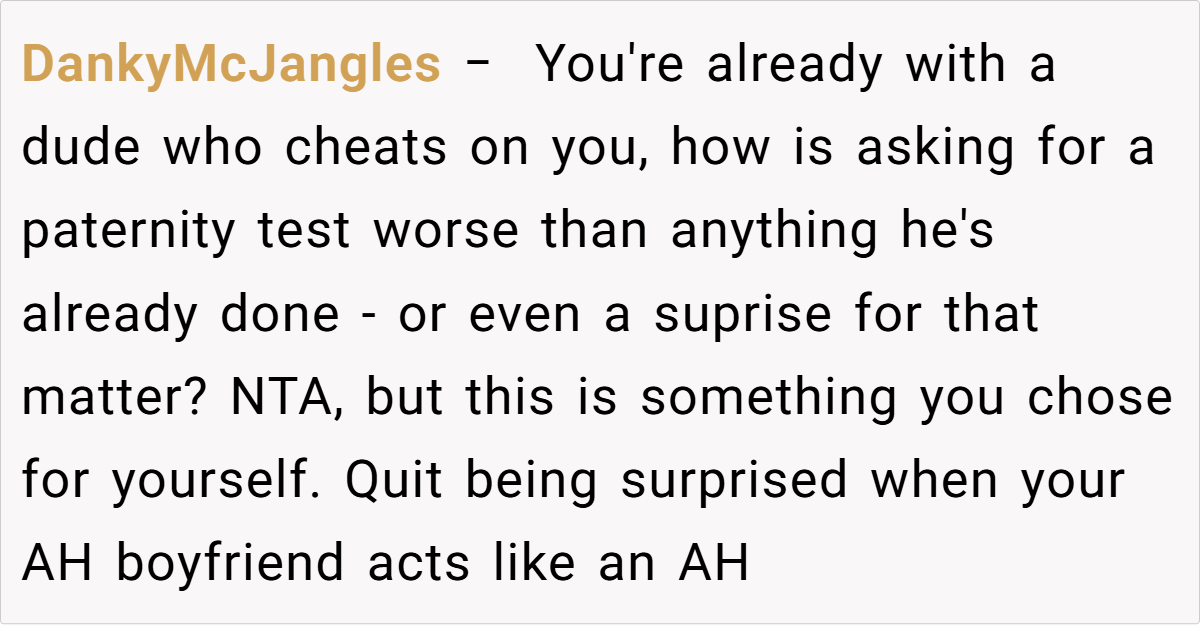 The bigger issue here is that the boyfriend’s behavior suggests he is already disengaged from the relationship. If he truly valued his partner, he would be prioritizing emotional security over unnecessary doubts. Instead of focusing on fatherhood, he is acting in a way that ensures his partner feels betrayed and distrusted during an already vulnerable time.