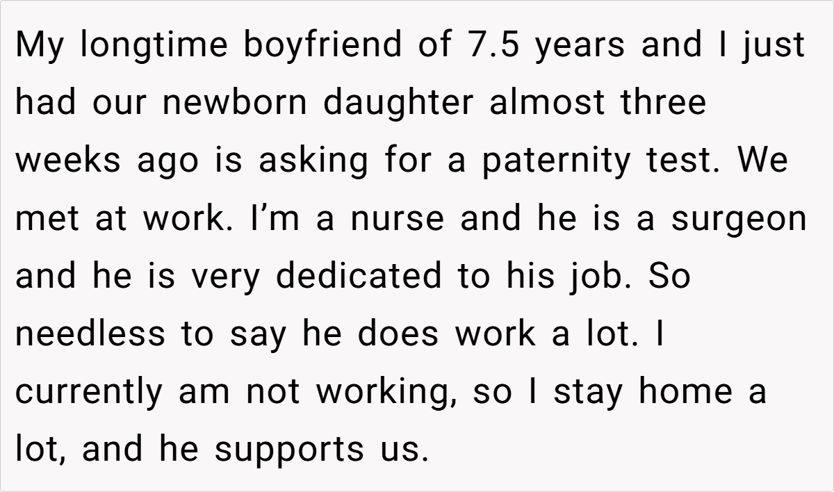 This exact dilemma unfolded for a woman who just gave birth to her daughter three weeks ago. After being with her boyfriend for over 7.5 years and remaining faithful despite his past “slip-ups,” she was blindsided when he requested a paternity test. His reasoning? He wants to be 100% certain the child is his—despite her unwavering loyalty. But is this simply an insecure man’s fear, or is there something deeper at play? Let’s dive into the details of her story.