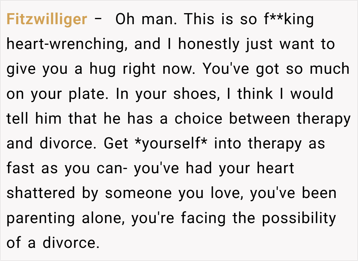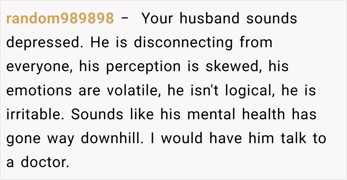 The Reddit community reacted with an outpouring of support and concern for the OP. Many users expressed shock and heartbreak at the husband’s words, urging her to prioritize her well-being and consider divorce. Several commenters suspected infidelity due to the husband’s recent behavior. Others suggested that he may be struggling with unresolved grief or depression and needs professional help.