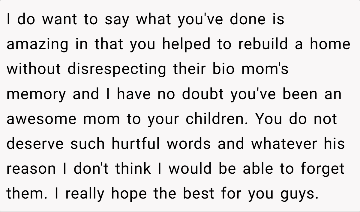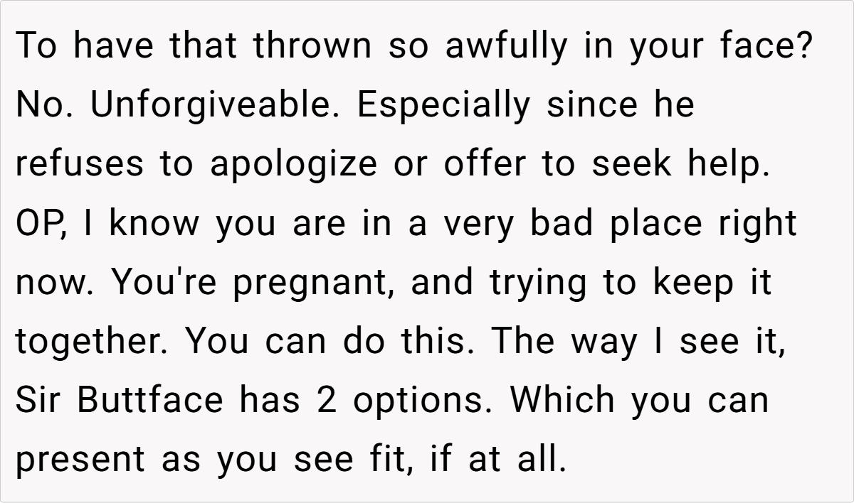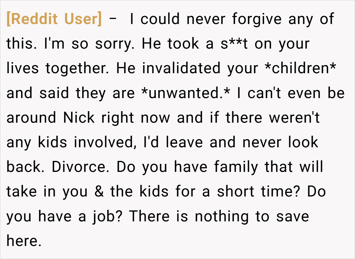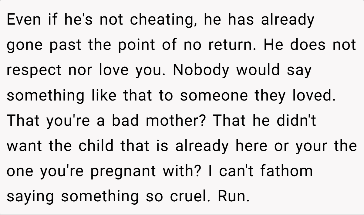 Some users emphasized the unforgivable nature of his hurtful comments, particularly regarding her role as a stepmother and the unwanted pregnancy. While some offered practical advice like consulting a lawyer and securing her finances, the overall sentiment was that the husband’s actions were a betrayal and that she should seriously consider leaving the marriage for her own sake and the well-being of her children.