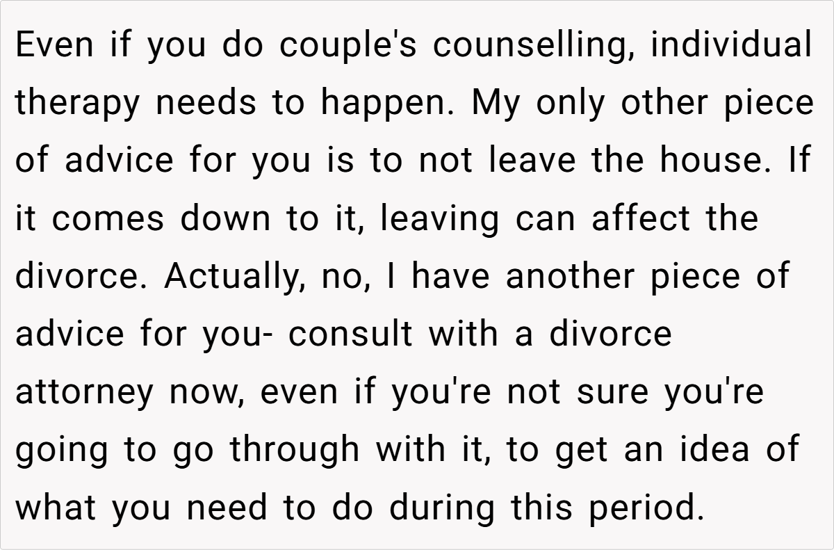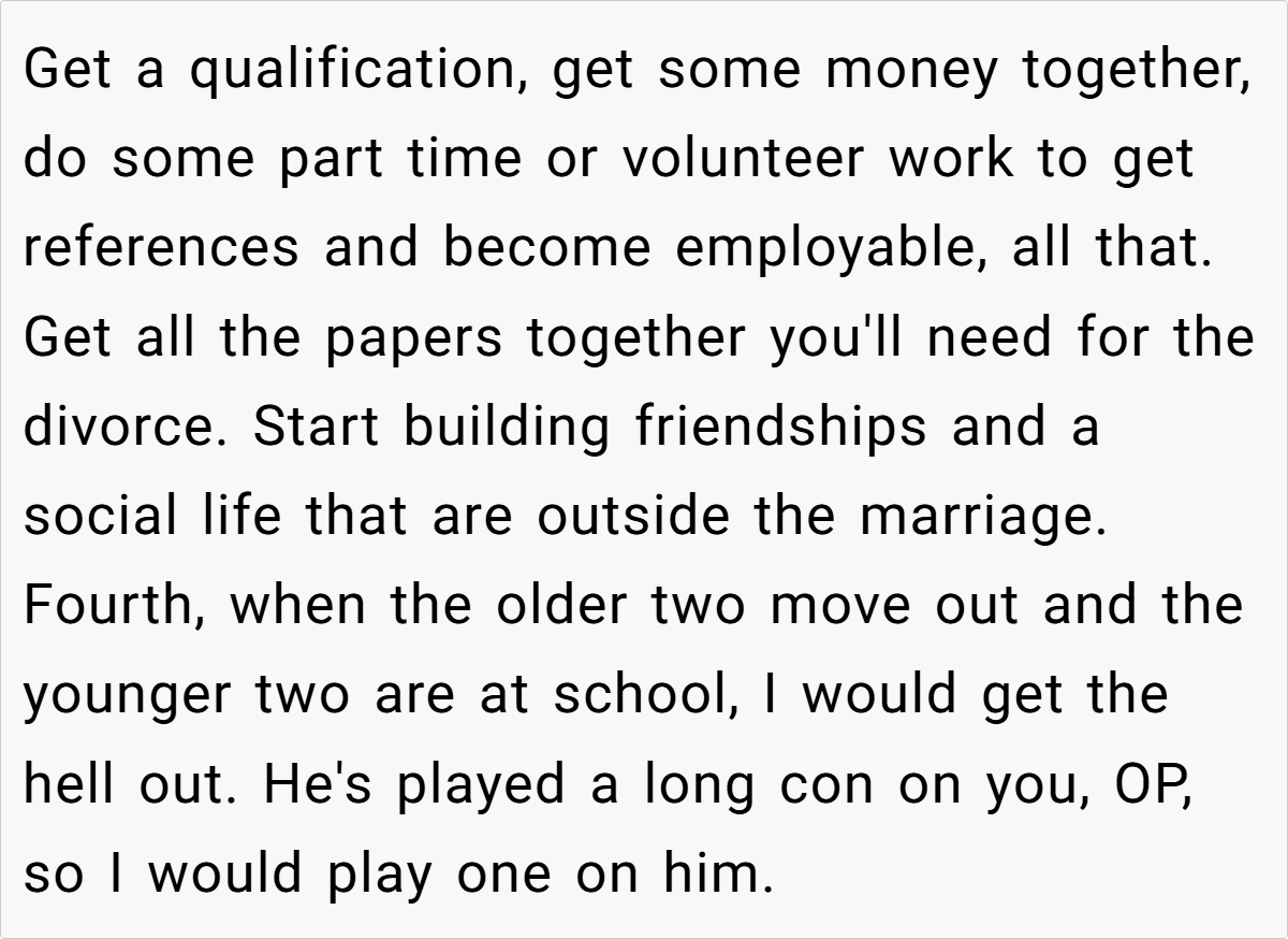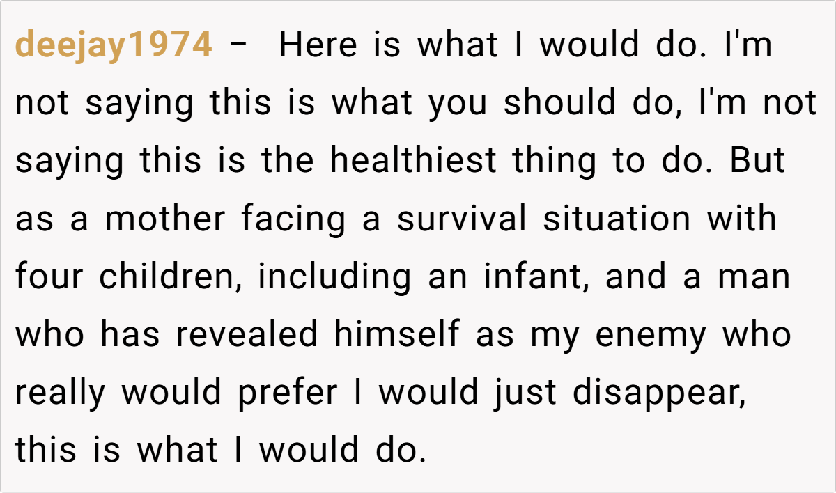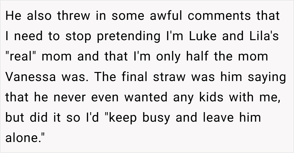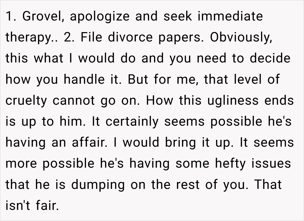Some users emphasized the unforgivable nature of his hurtful comments, particularly regarding her role as a stepmother and the unwanted pregnancy. While some offered practical advice like consulting a lawyer and securing her finances, the overall sentiment was that the husband’s actions were a betrayal and that she should seriously consider leaving the marriage for her own sake and the well-being of her children.