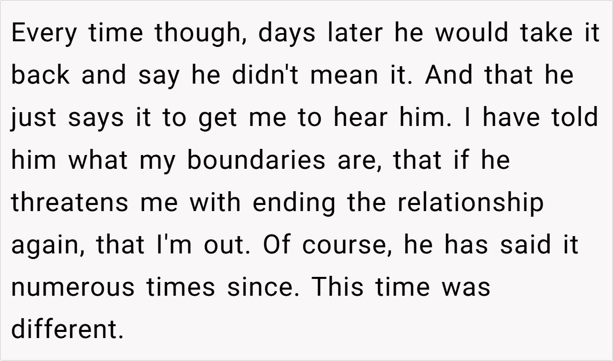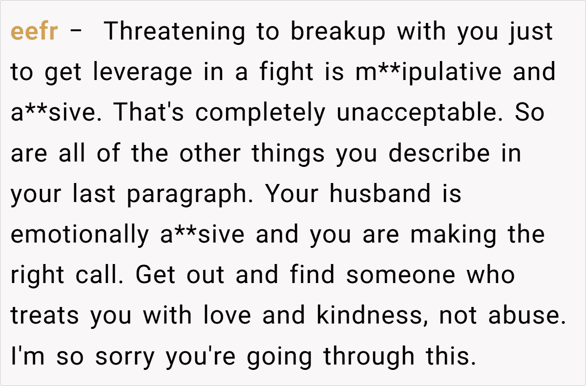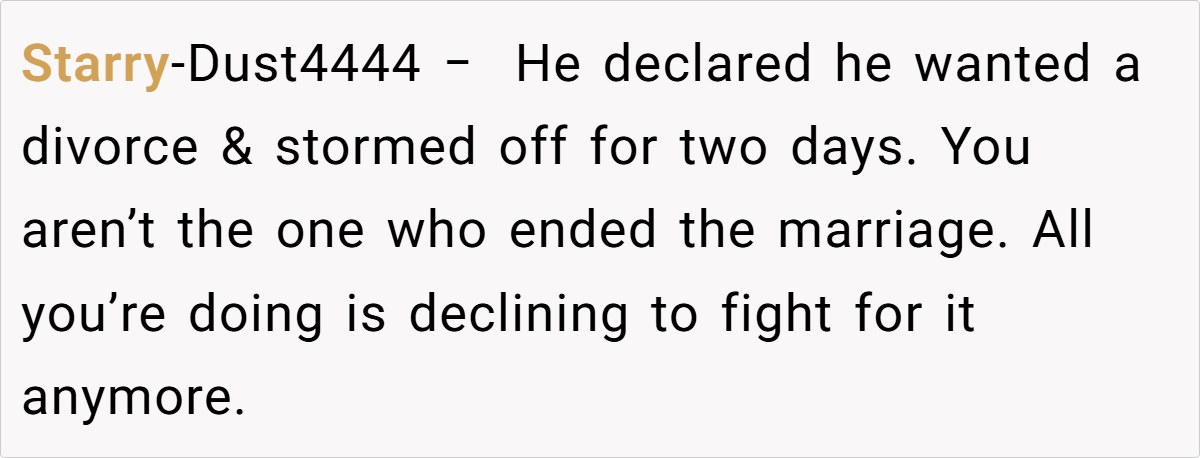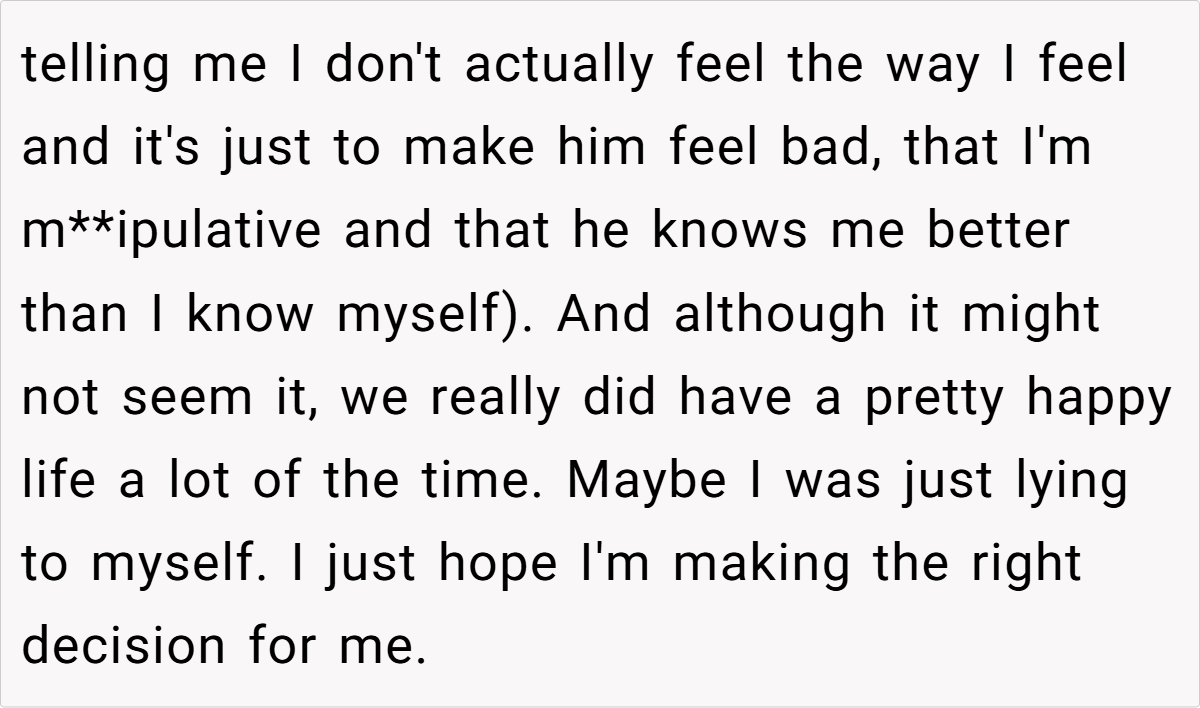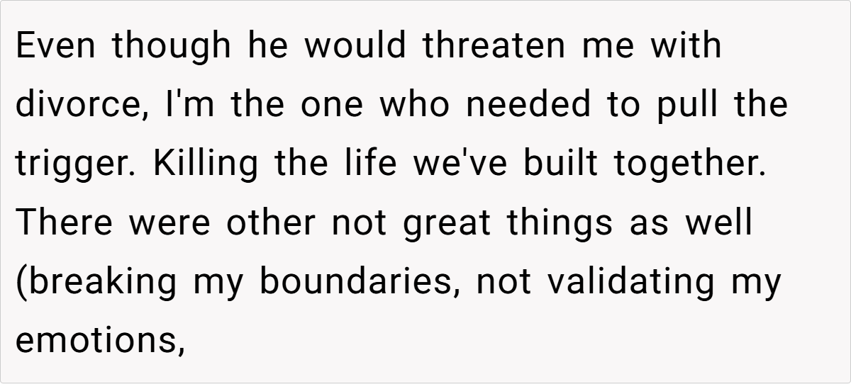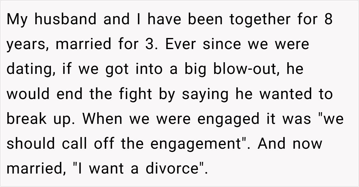 A woman (33M) shares the painful decision to end her marriage after her husband (35M) repeatedly threatened divorce during fights, only to take it back later. After years of emotional manipulation and broken boundaries, she finally decided to move forward with a divorce, but now struggles with guilt. Read the full story below: