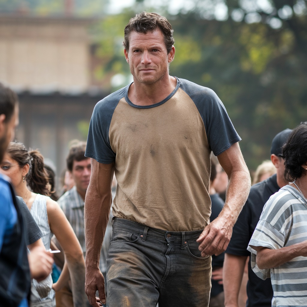 A man stepped out from the group. He was tall, with sun-weathered skin and a confident demeanor. His old T-shirt and dusty jeans contrasted sharply with his sharp gaze and assured stance.