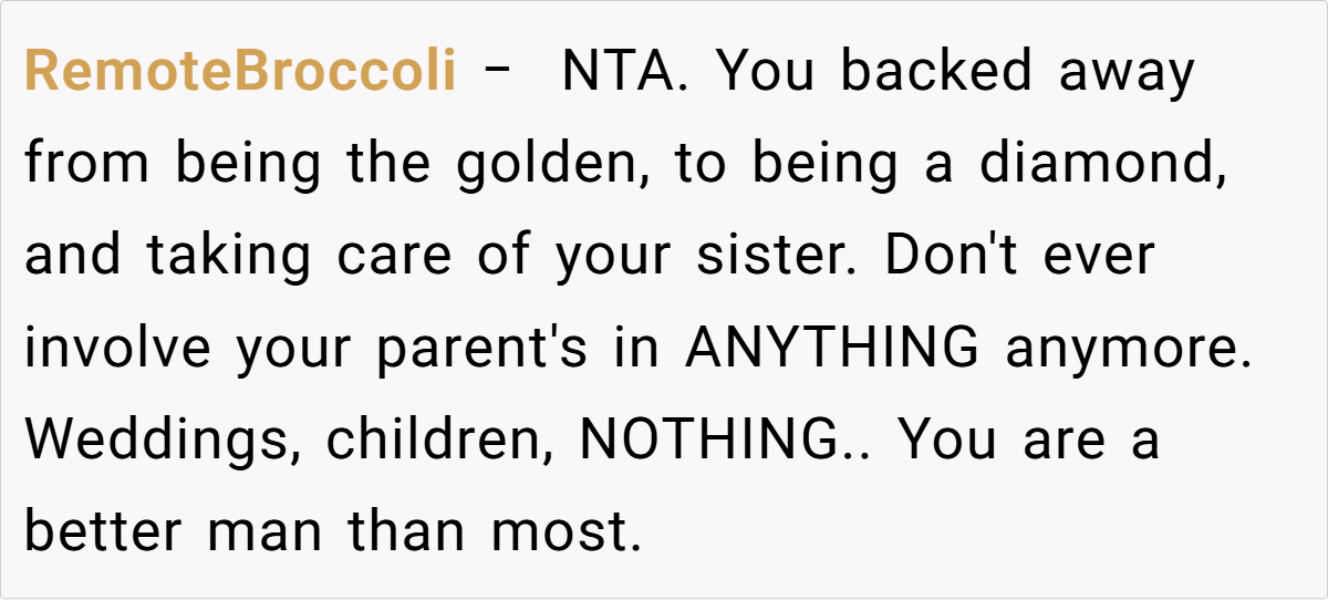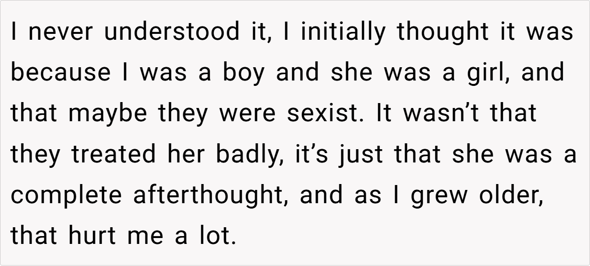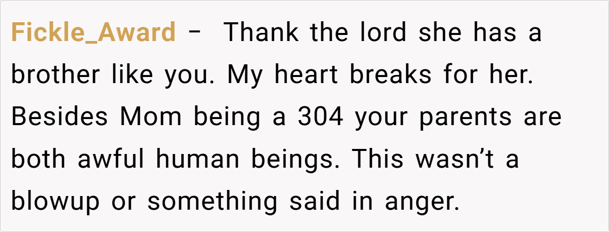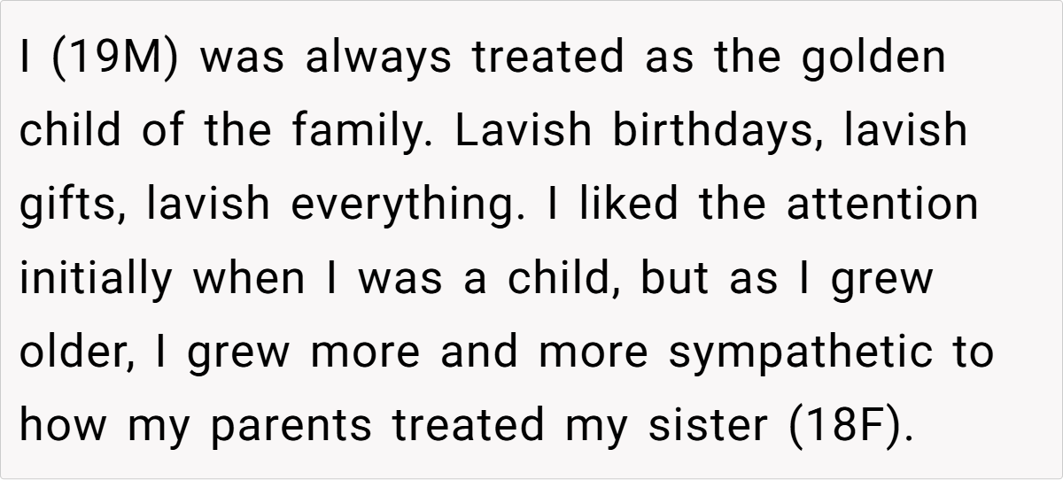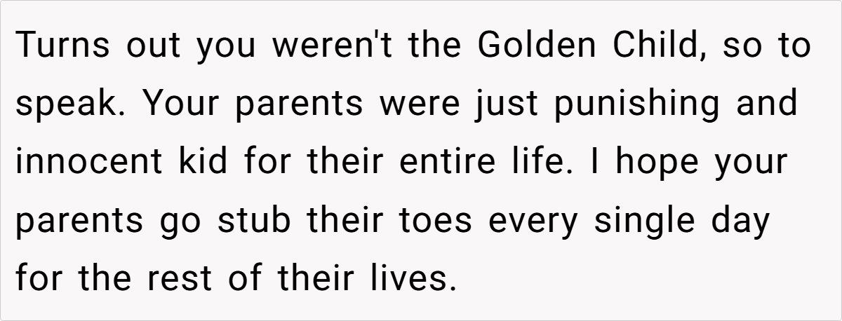 In examining the post, it is evident that the young man’s long-simmering resentment stemmed from years of unequal treatment and the pain of being forced to watch his sister suffer. His initial acceptance of preferential treatment gave way to empathy and eventually, disillusionment. The conflict isn’t merely about favoritism—it’s about the deep emotional neglect and betrayal that have undermined his self-esteem. By deciding to sever ties with his parents, he prioritizes his mental health over the painful legacy of their actions.