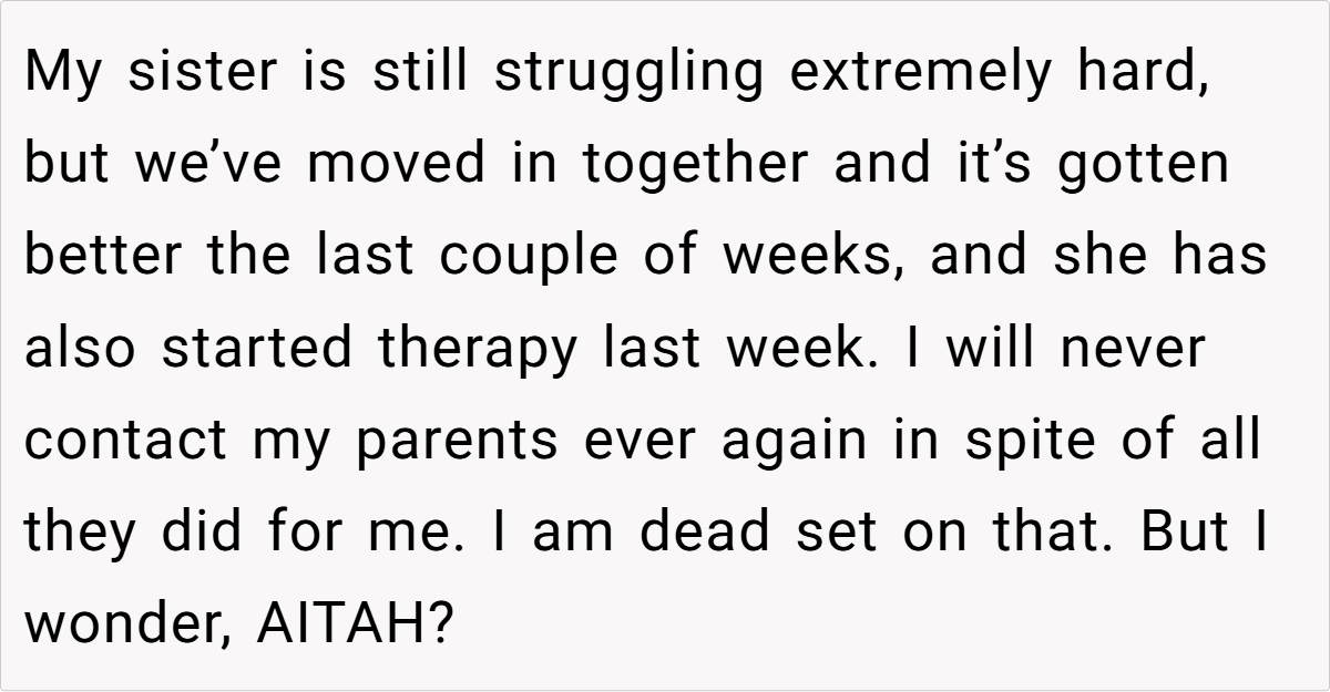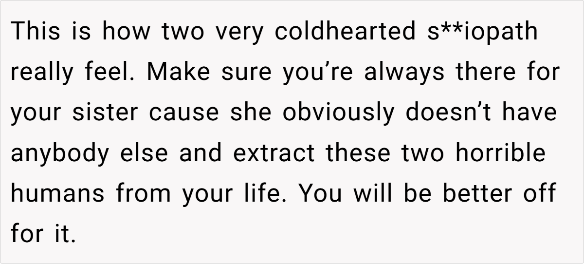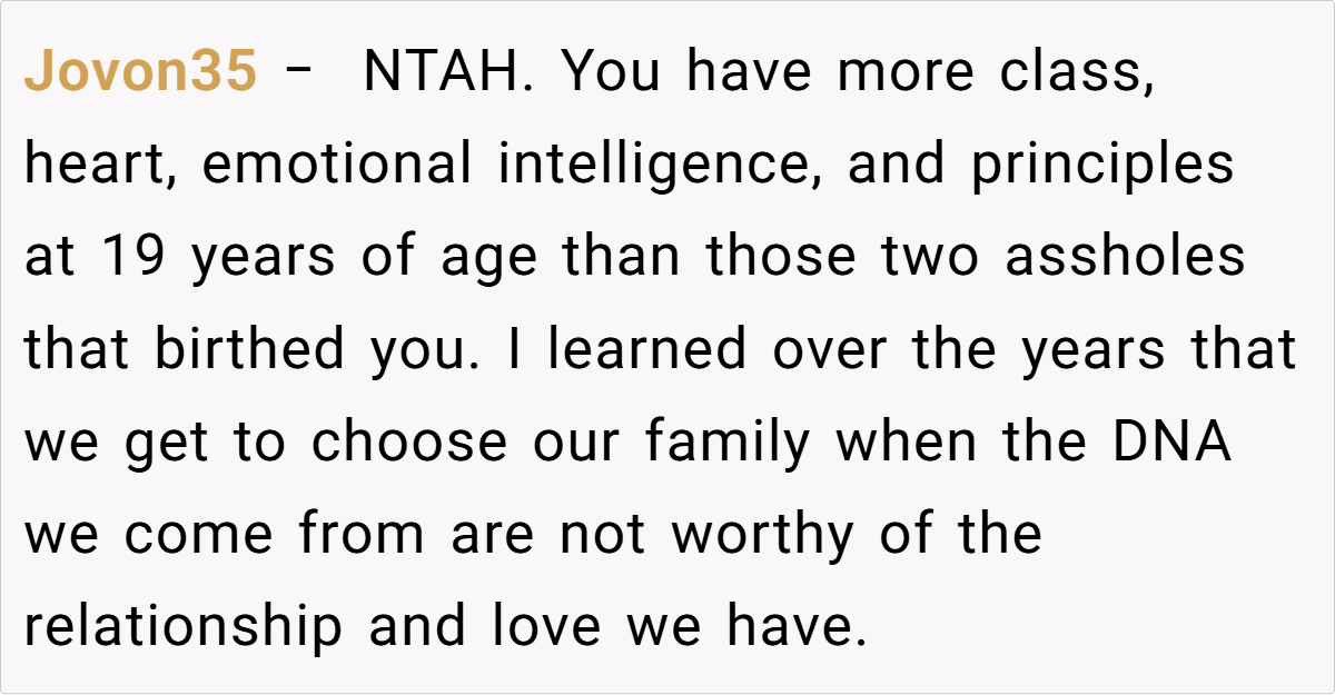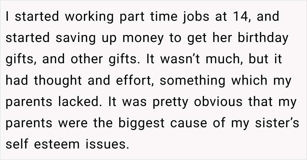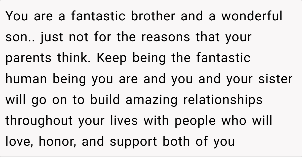 In examining the post, it is evident that the young man’s long-simmering resentment stemmed from years of unequal treatment and the pain of being forced to watch his sister suffer. His initial acceptance of preferential treatment gave way to empathy and eventually, disillusionment. The conflict isn’t merely about favoritism—it’s about the deep emotional neglect and betrayal that have undermined his self-esteem. By deciding to sever ties with his parents, he prioritizes his mental health over the painful legacy of their actions.