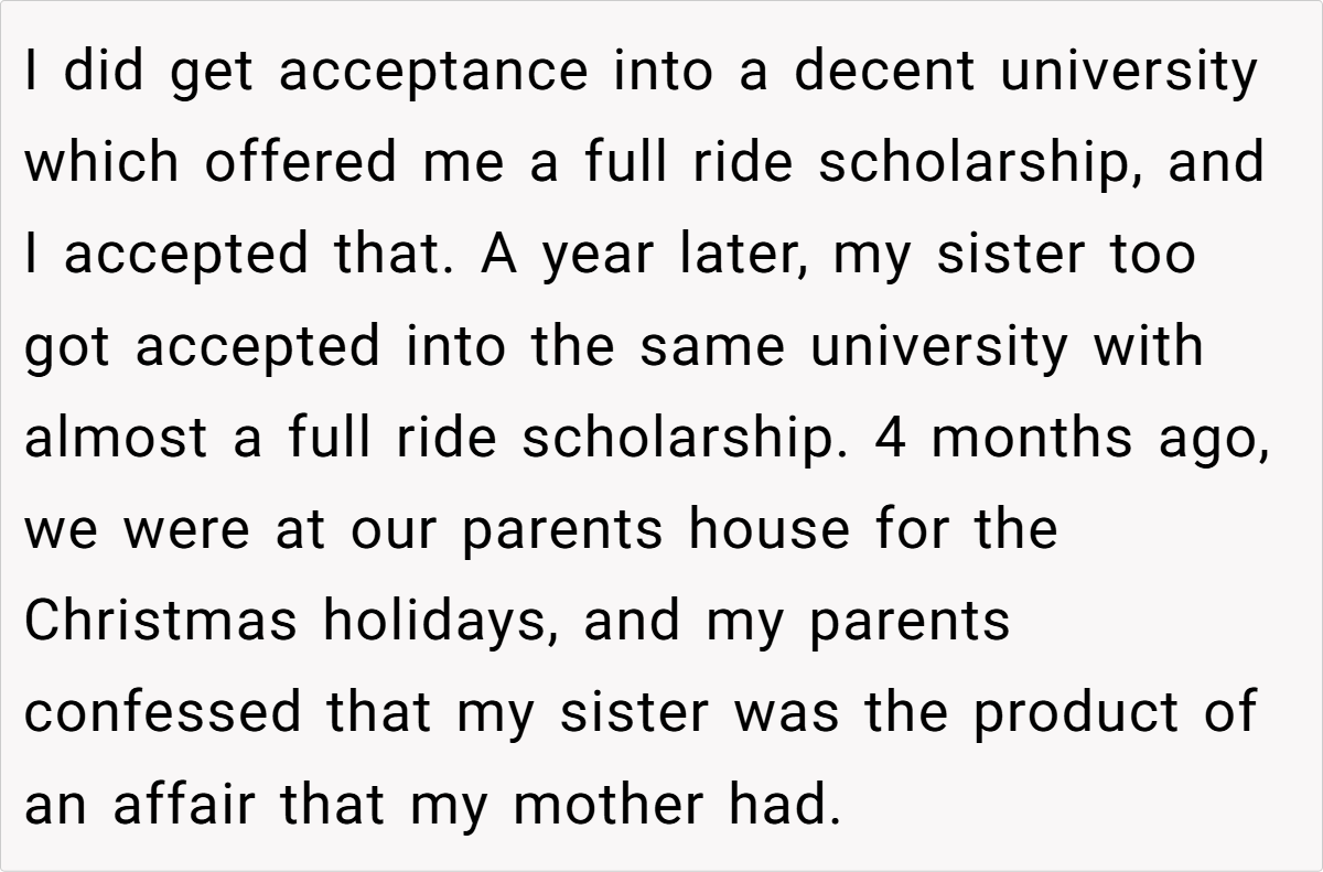 ‘My parents confessed last Christmas that my sister was the product of my mother’s affair. AITAH for cutting my parents out of my life?’