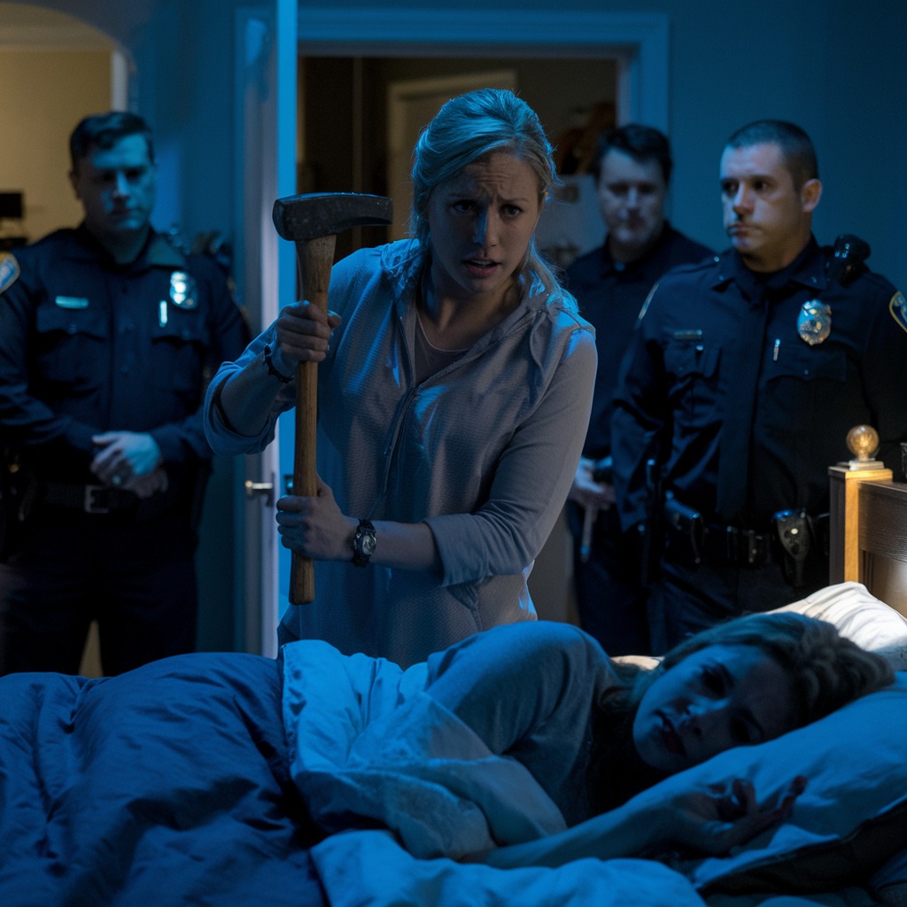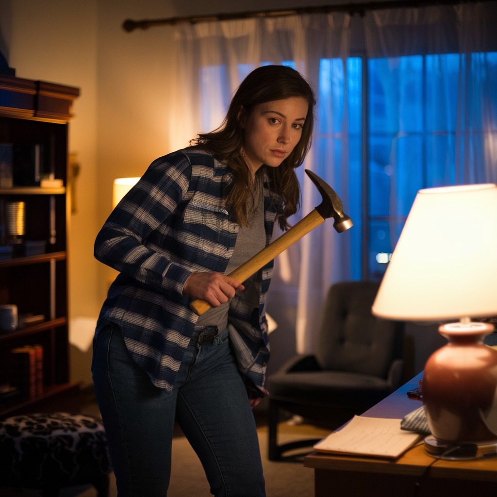 As Jane fell into a deep sleep, the door to her room suddenly creaked open. Amy silently entered, holding a hammer. She slowly approached Jane’s bed and stood watching her for a moment. Then, the lights flashed on, and a voice shouted, “Hands up!”