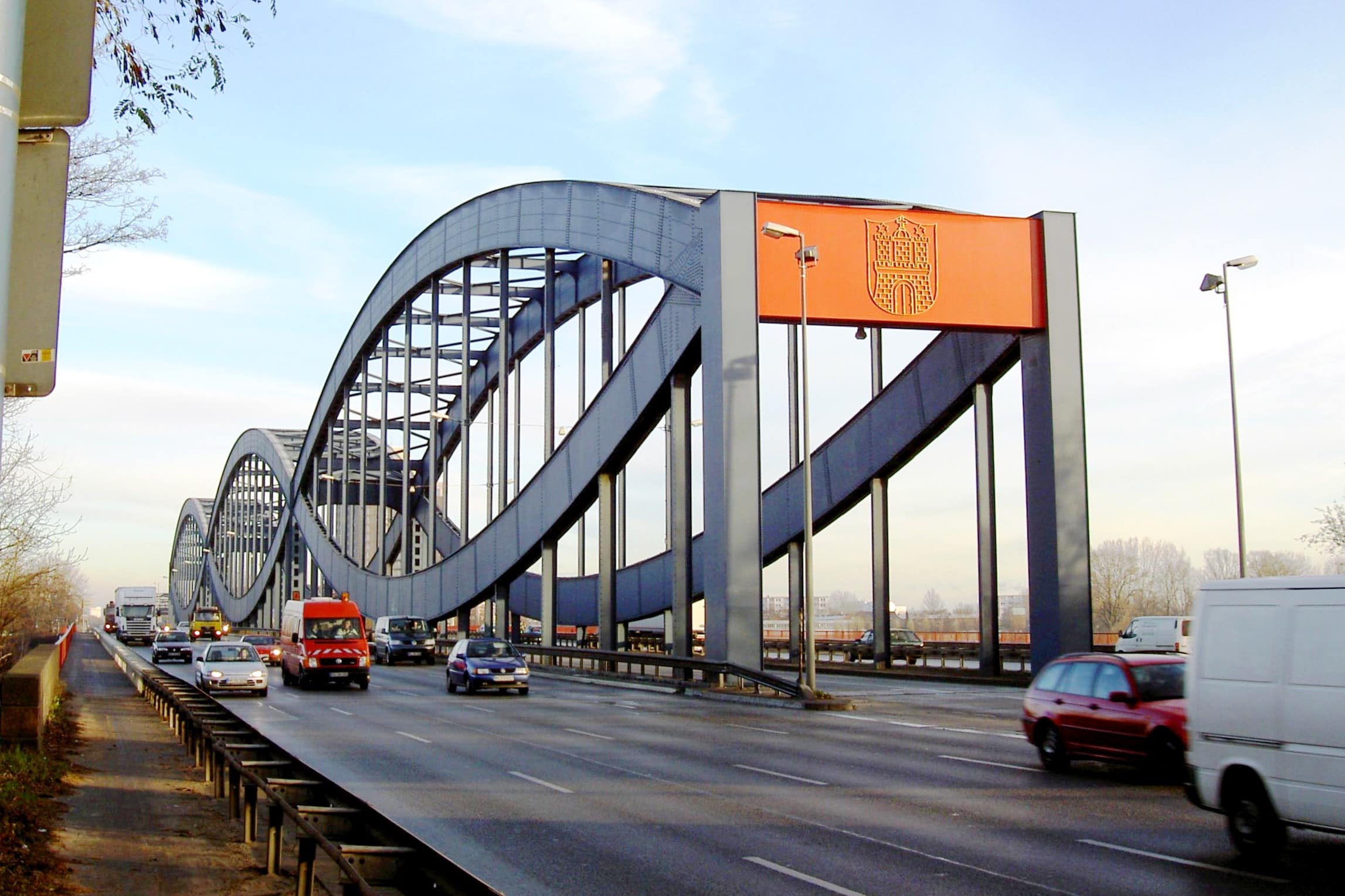 The Neue Elbbrücke crosses the Norderelbe, one of the main branches of the Elbe River in Hamburg.