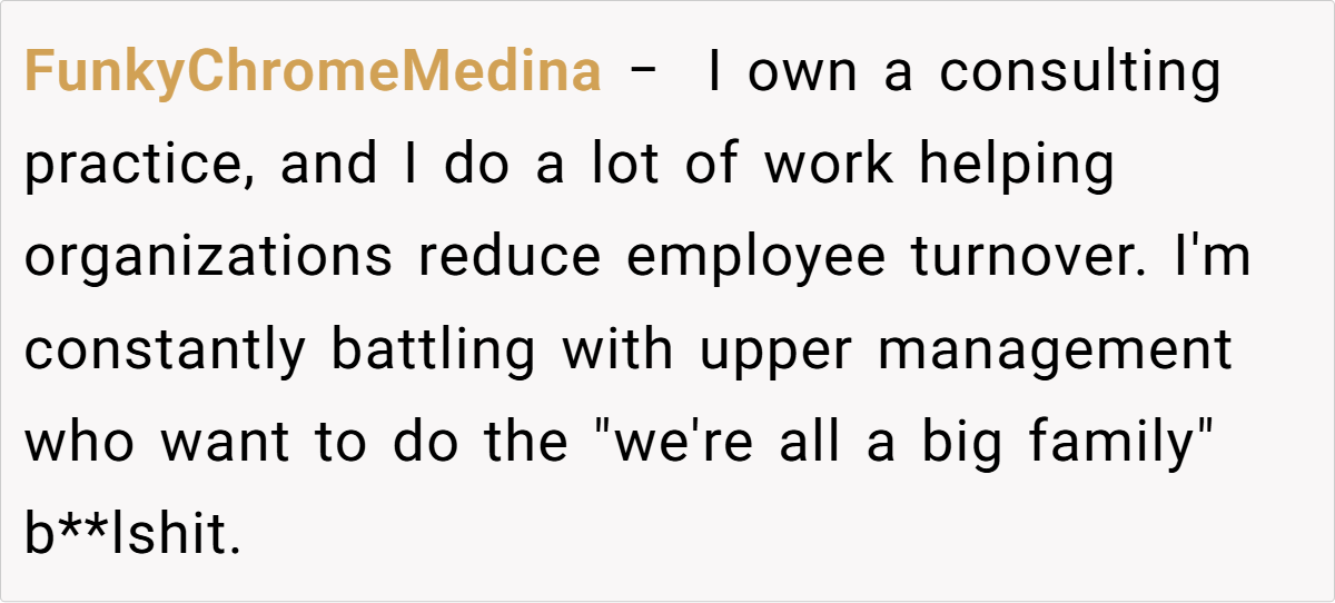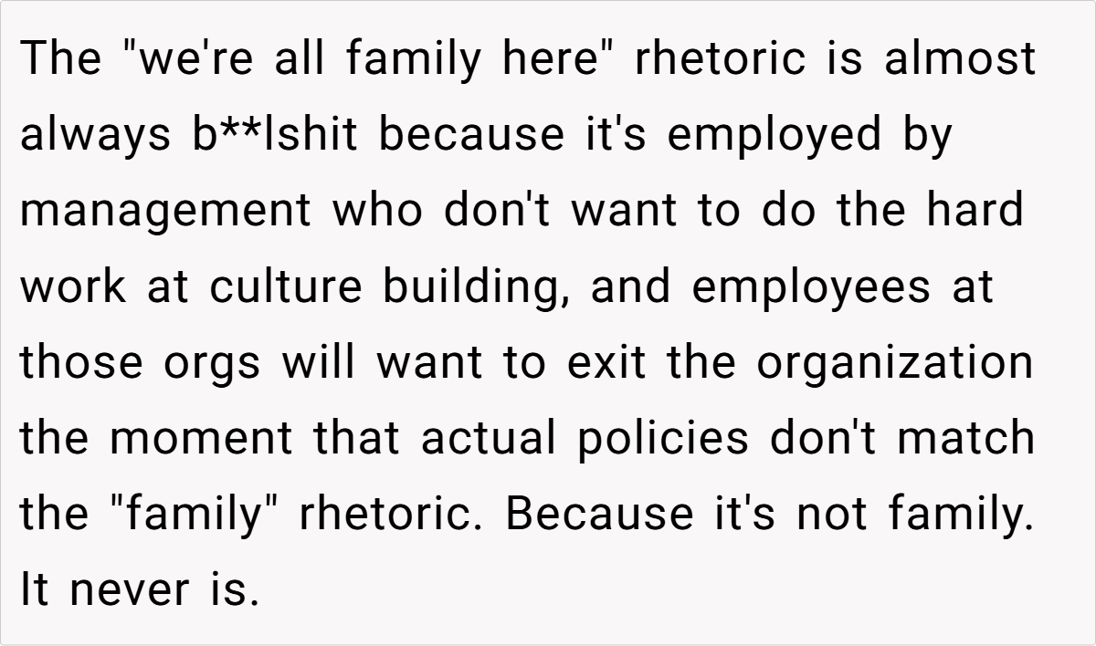 Here are some hot takes from the Reddit community—candid, humorous, and refreshingly blunt. The diverse opinions captured below reveal the everyday frustrations of those who’ve endured the “family culture” paradox firsthand. While these commentaries are both relatable and entertaining, they also spark a broader debate: do these fiery rants reflect the true state of our workplaces, or are they simply the quirks of one office dynamic?