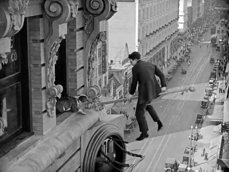 As he climbs higher, Harold Lloyd faces a series of increasingly challenging obstacles, including a flock of pigeons, getting tangled in a net, navigating a painter’s trestle, dodging a swinging window, and finally confronting the clock itself.
