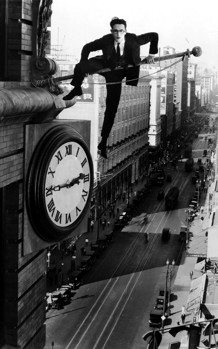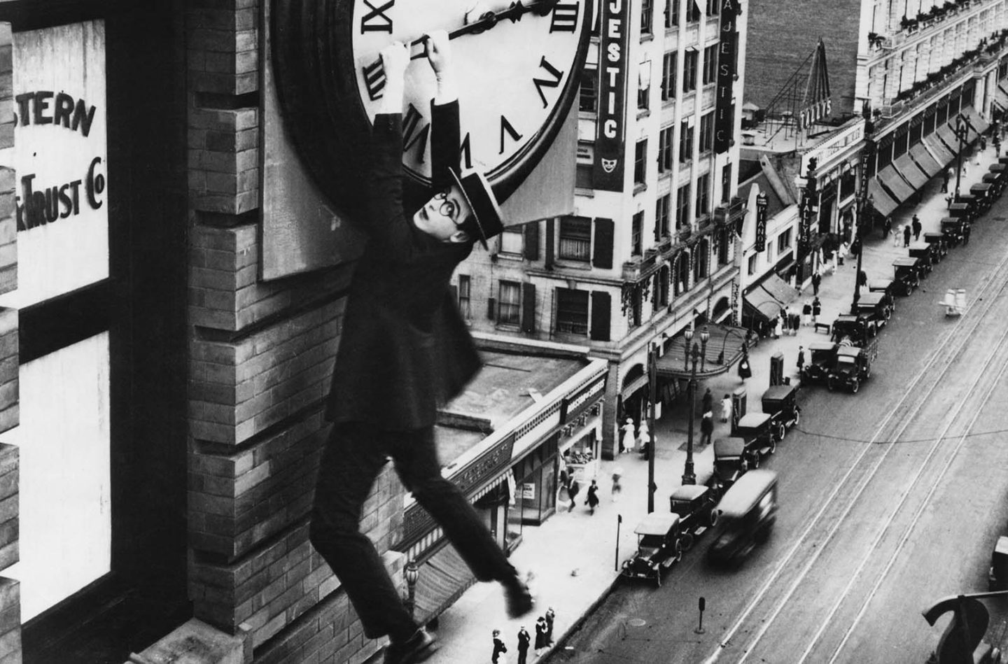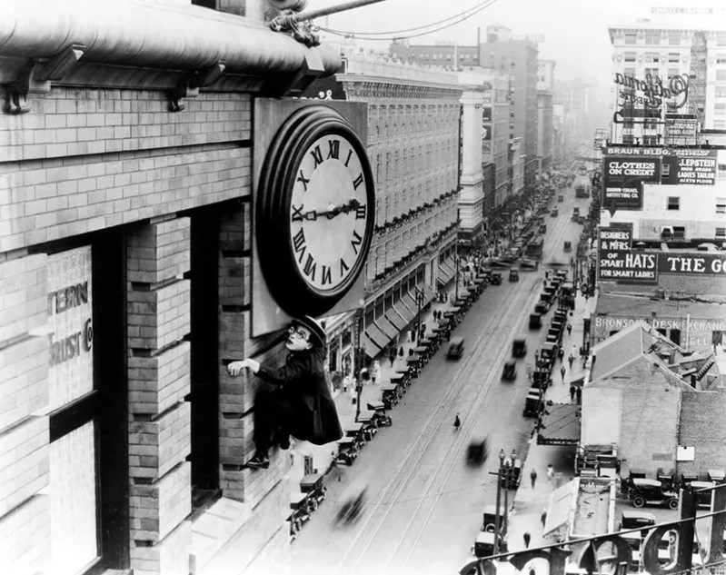Harold Lloyd’s memorable scene of hanging from a giant clock on a building is one of the most iconic moments of his career. This classic sequence brilliantly blends inspired comedy with intense suspense as it culminates in a breathtaking climb that serves as the grand finale to the clever gags that come before it.
