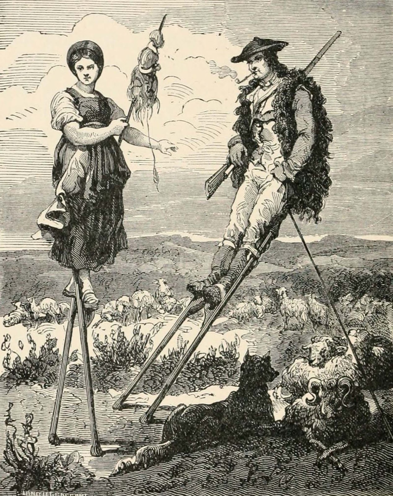In an 1891 Scientific American Supplement article, the shepherds of the Landes region were described using stilts known in the local Gascon dialect as “Tchangues,” meaning “big legs.” These wooden stilts, about five feet tall, had a strap to secure the walker’s foot, and the bottom was often reinforced with sheep bone.