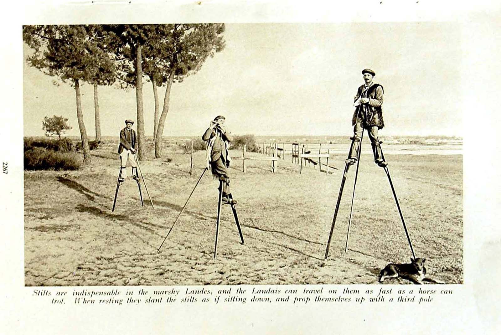 The stilt shepherds of Landes were written about in the Scientific American Supplement, No. 821, Sep. 26, 1891: “The shepherds of Landes… acquire an extraordinary freedom and skill … knows very well how to preserve his equilibrium; he walks with great strides, stands upright, runs with agility, or executes a few feats of true acrobatism, such as picking up a pebble from the ground, plucking a flower, simulating a fall and quickly rising, running on one foot, etc”.