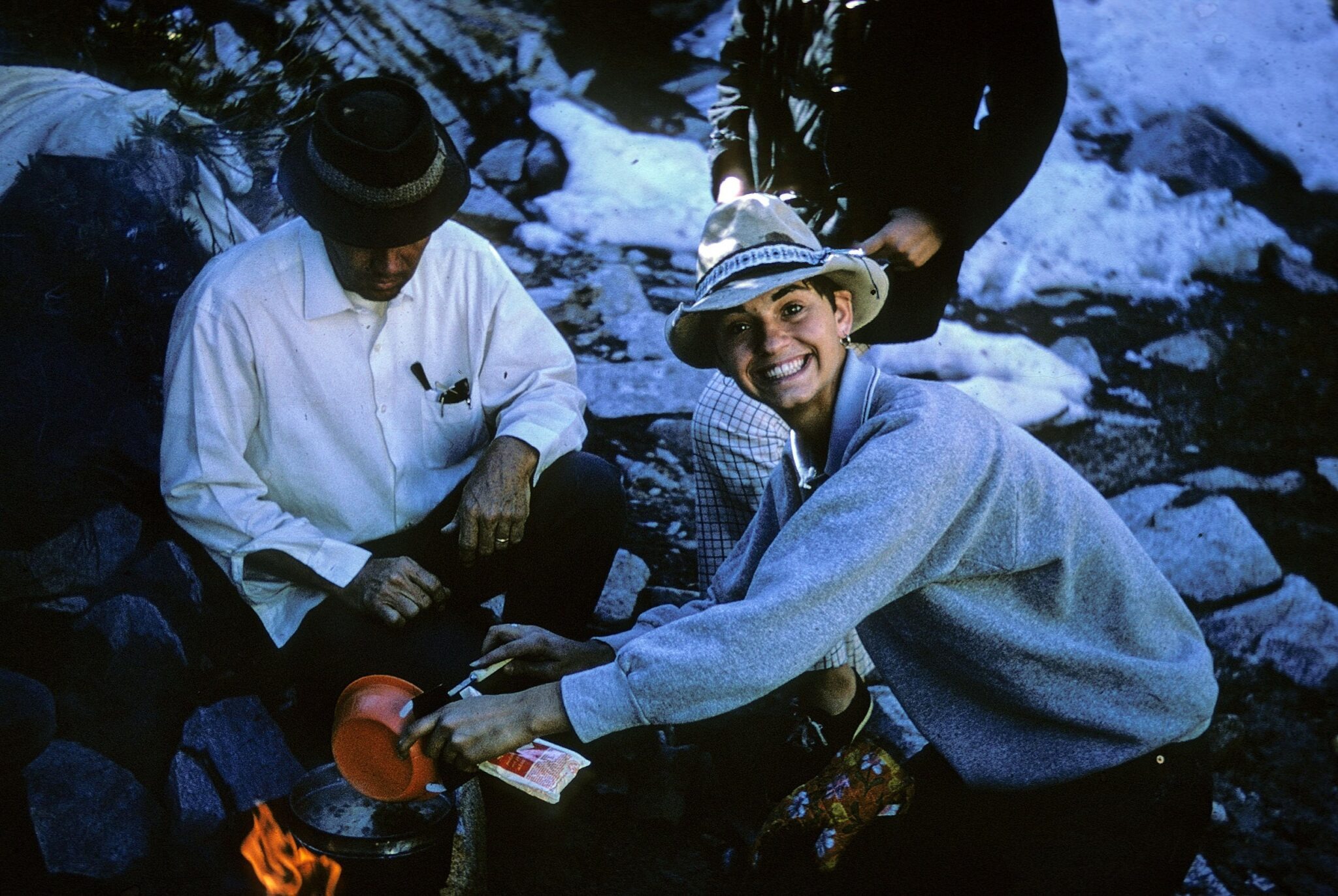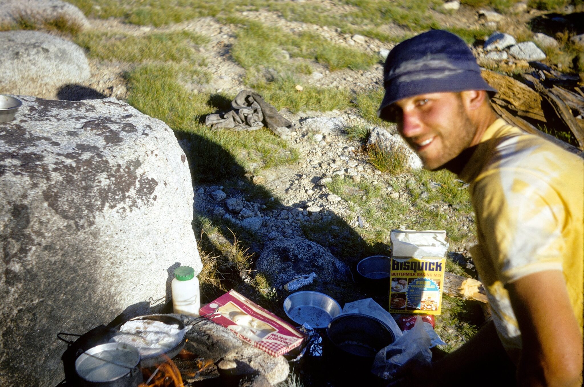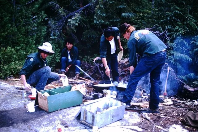 Campers used steel cook sets, but there were no fancy lightweight stoves or water filters. Meals were cooked over wood fires using simple tools, and the joy came from cooking together around the fire.
