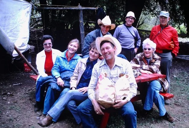 14. A group of friends and family gathered around a picnic table, dressed in classic 70s outdoor attire