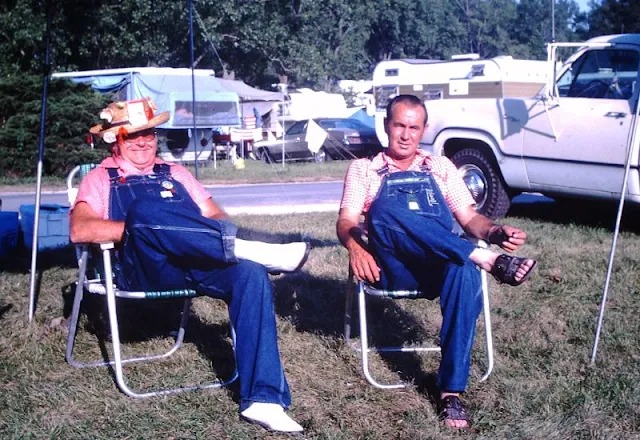 21. Two men, dressed in matching overalls and plaid shirts, are relaxing in lawn chairs