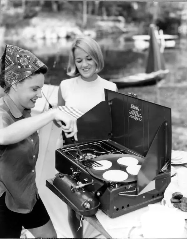 26. Two women happily cooking pancakes on a classic Coleman stove