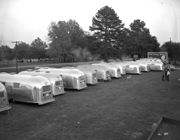 28. A row of sleek Airstream trailers parked in a neat line