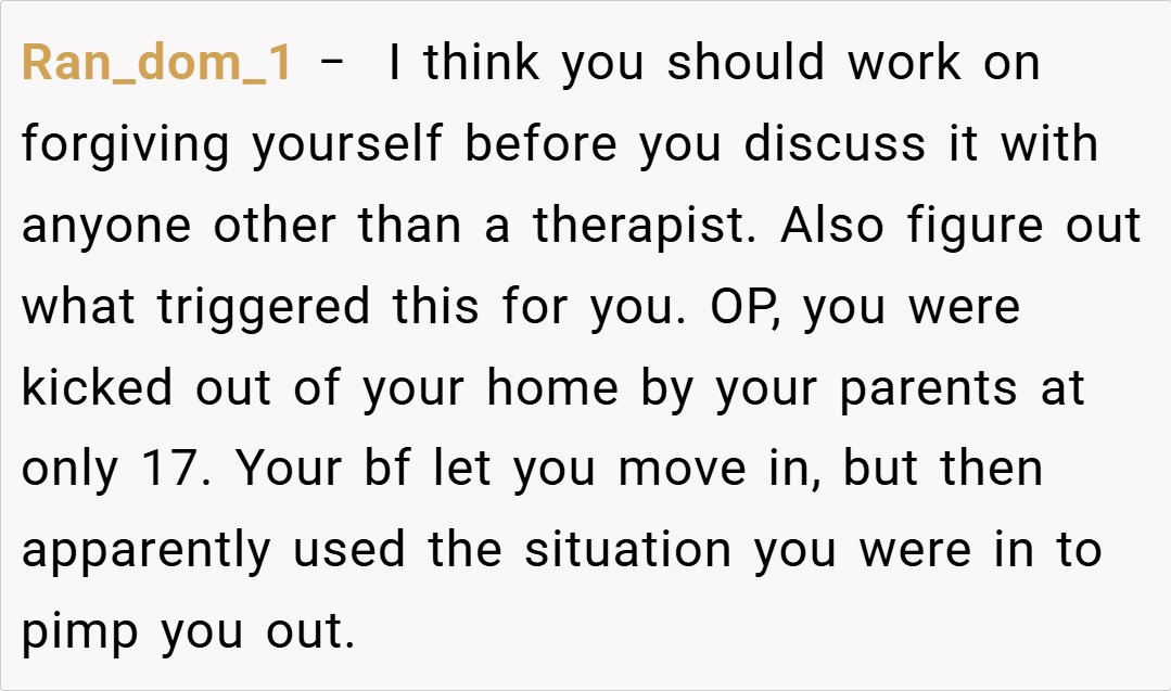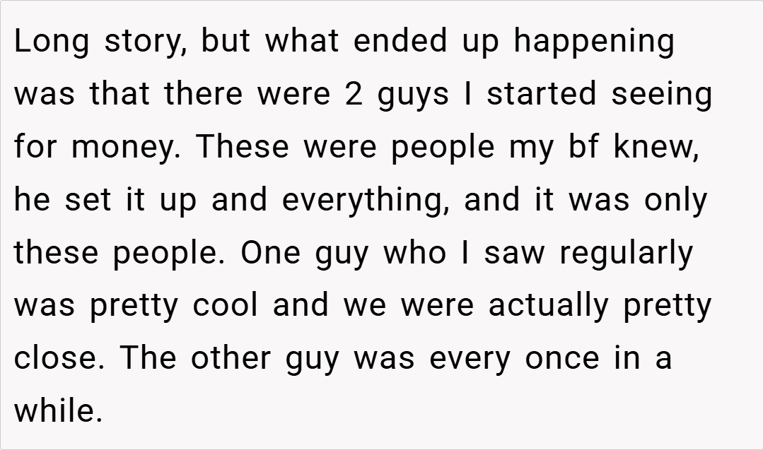 Forced into independence when her parents kicked her out at 17, she ended up relying on her then‑boyfriend—and through him, engaging with two men for money. Although those experiences helped her survive financially during her school years, they now leave her depressed, anxious, and desperate to know whether she should confess to her loving husband.