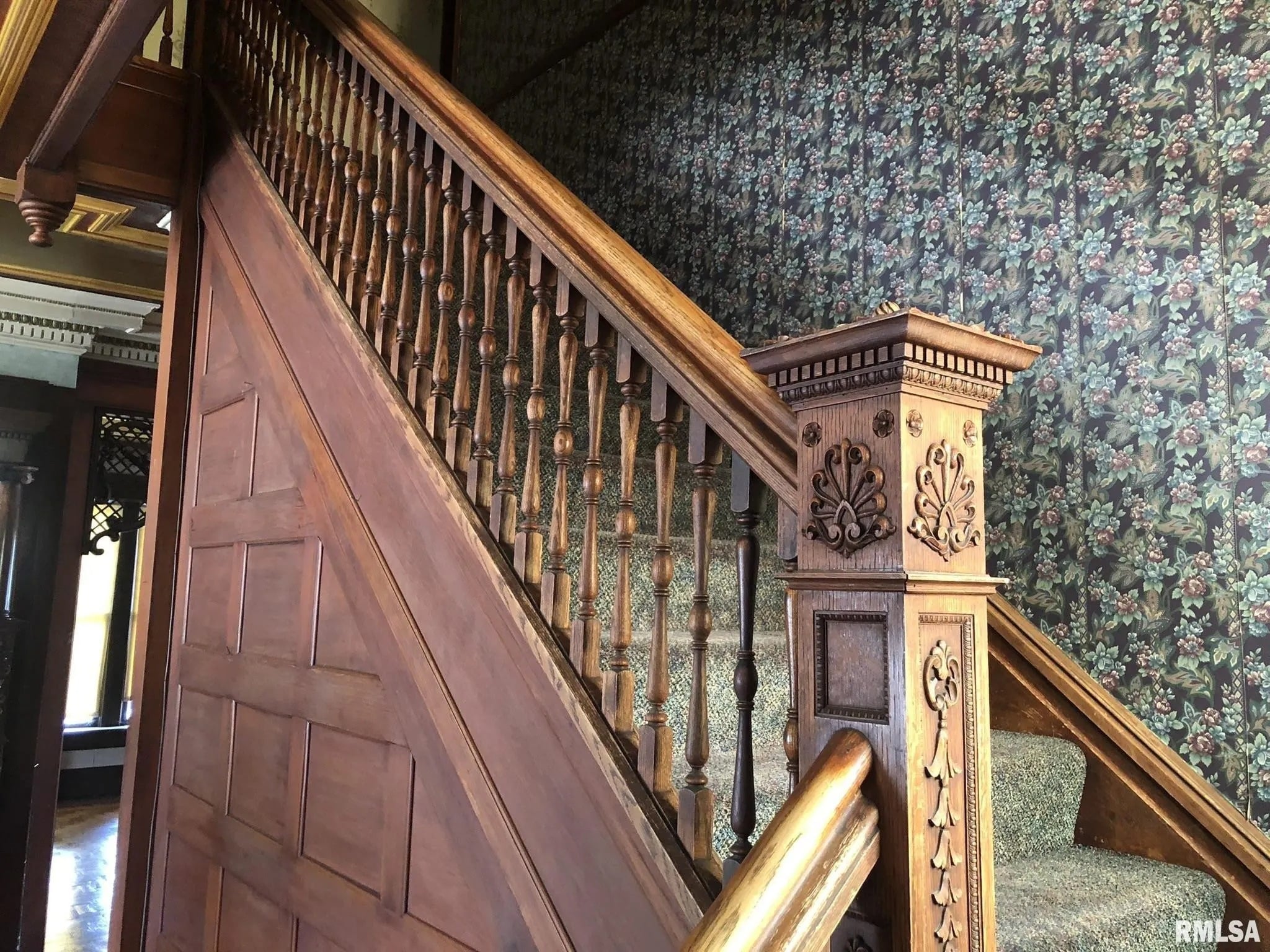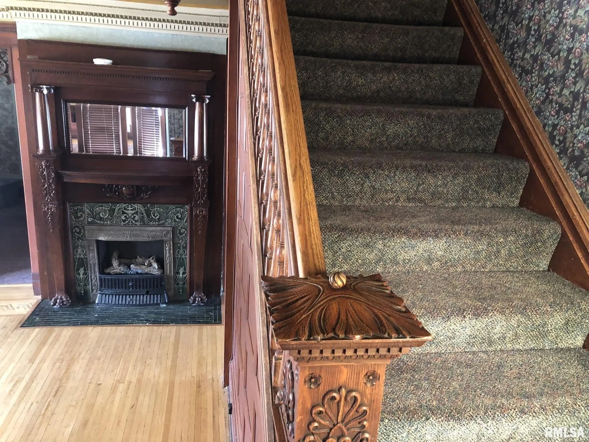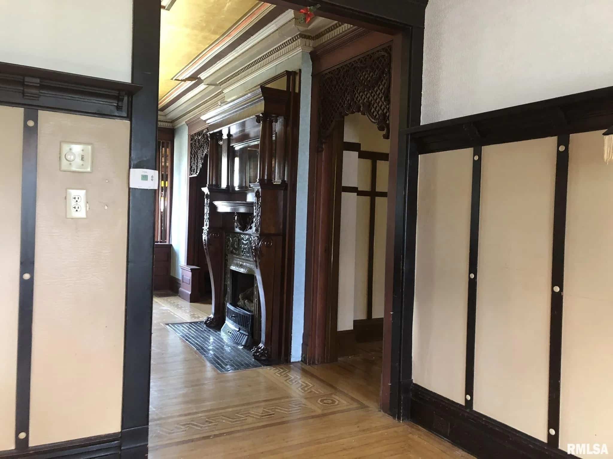 It is situated near properties zoned B-2 General Business, offering highway frontage and rear alley access. Notable features include ornate ceilings, stained glass windows, a wood staircase, a gorgeous fireplace, and an ornate wood-framed mirror.