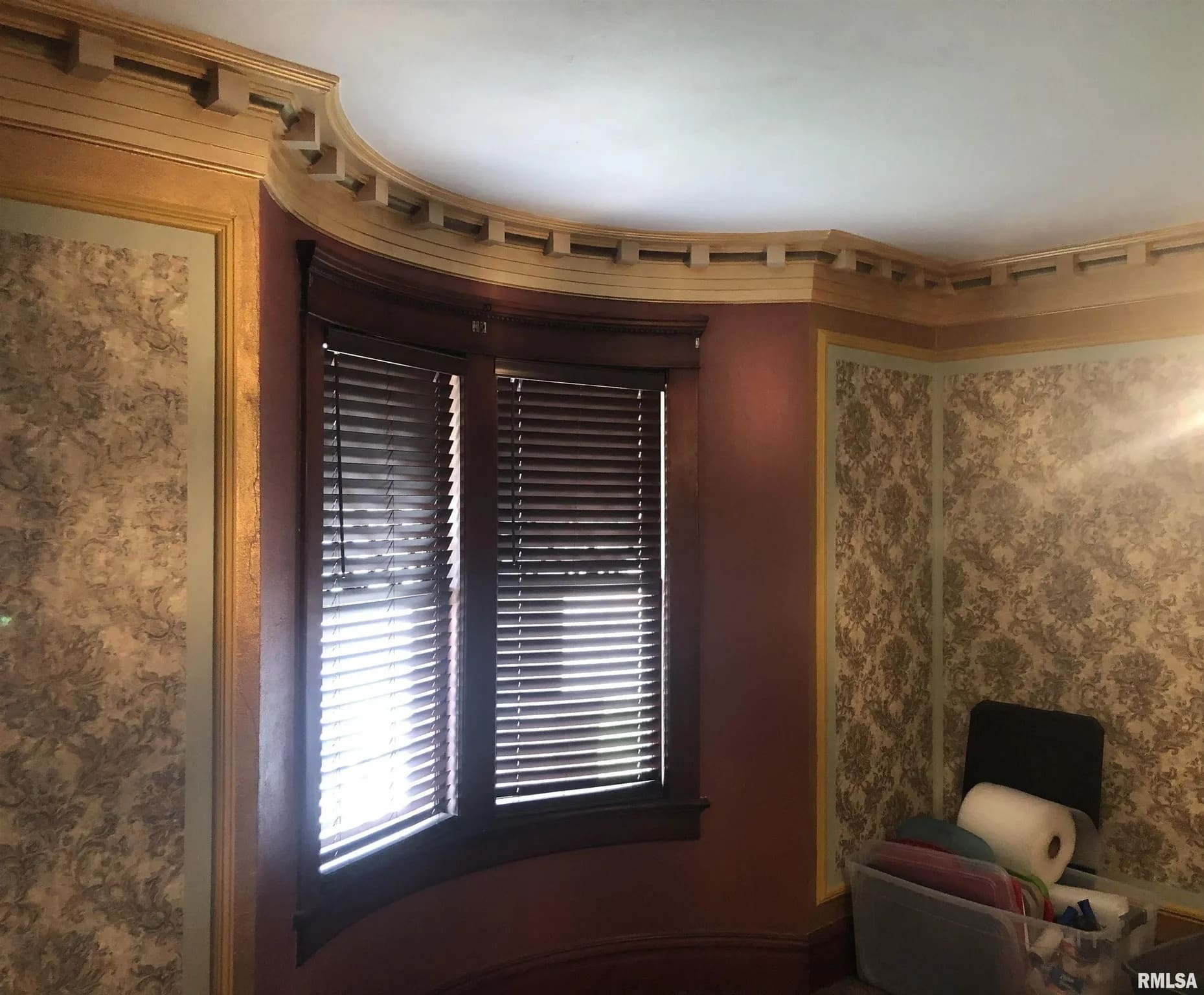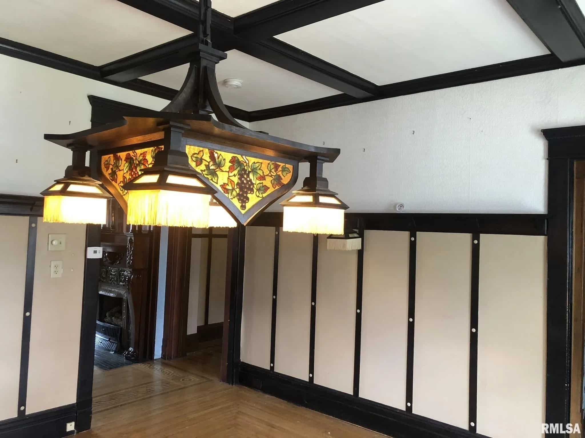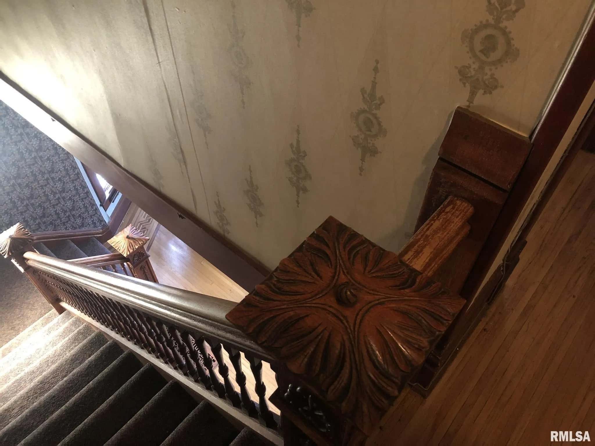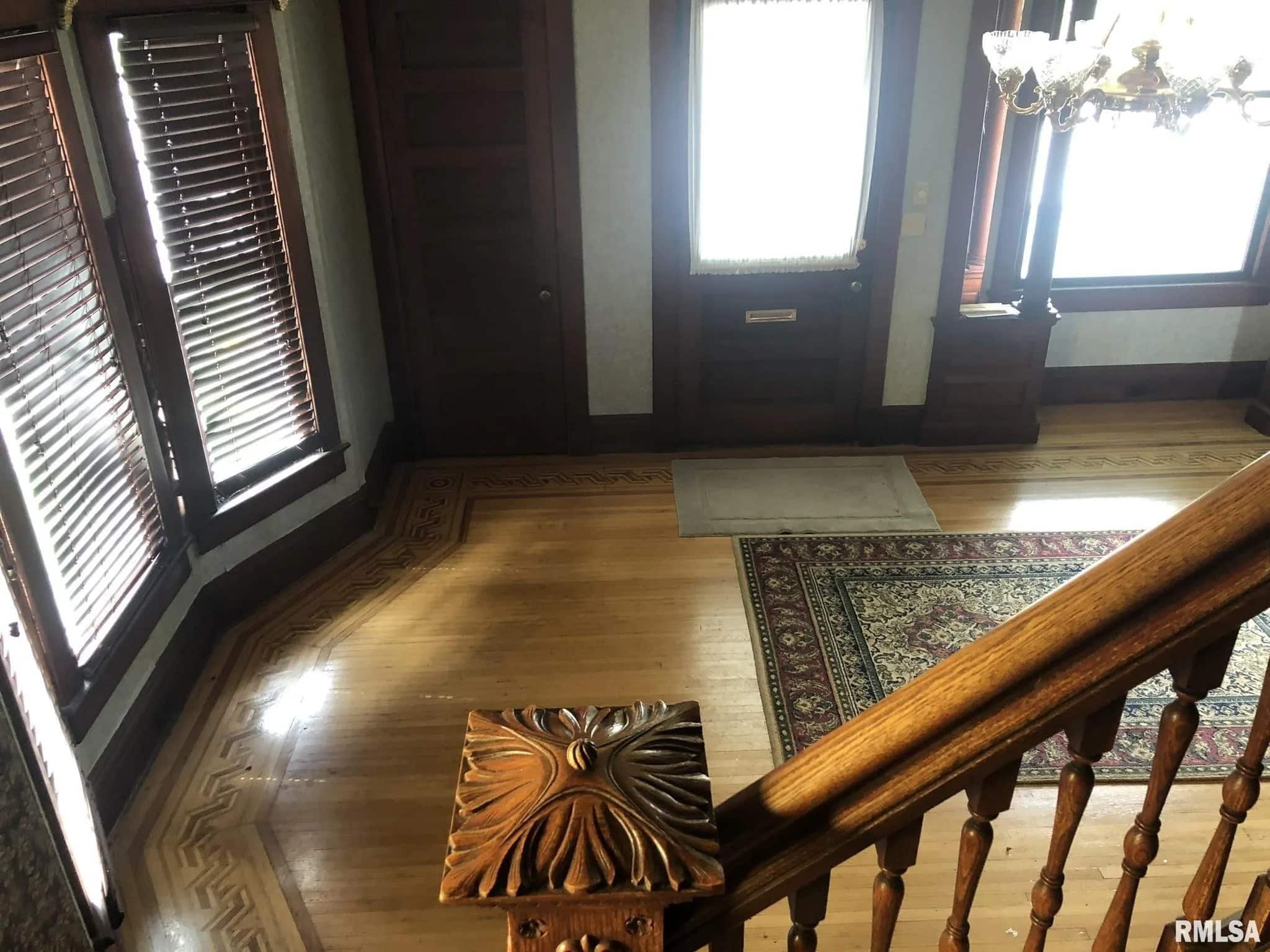 It is situated near properties zoned B-2 General Business, offering highway frontage and rear alley access. Notable features include ornate ceilings, stained glass windows, a wood staircase, a gorgeous fireplace, and an ornate wood-framed mirror.