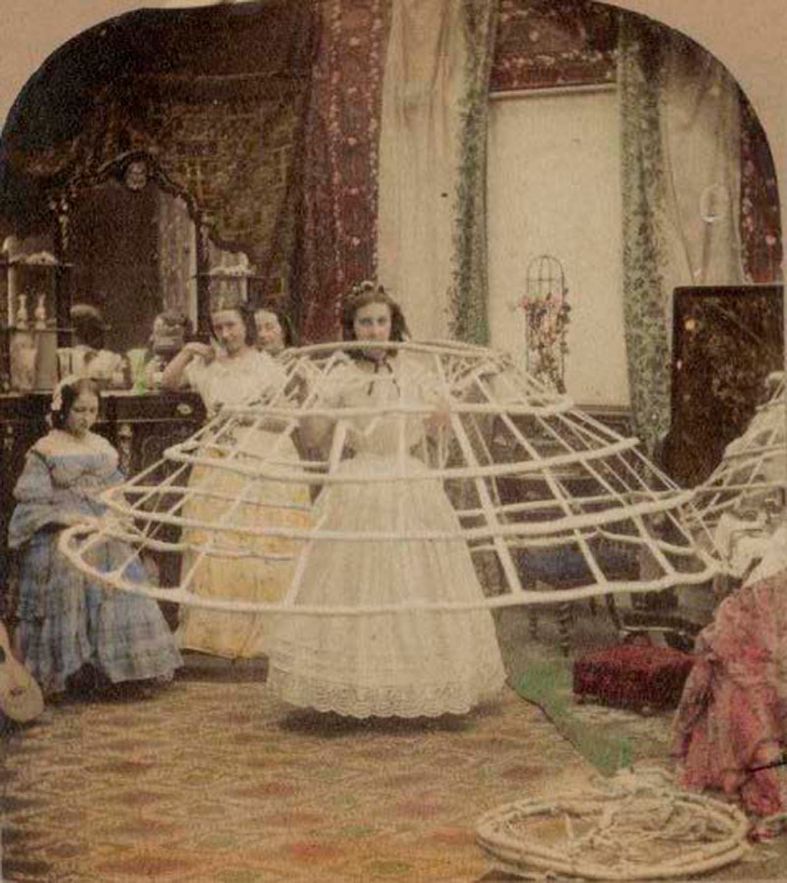 Crinolines were the epitome of mid-nineteenth-century fashion, giving women the coveted bell-shaped silhouette. Made of horsehair and steel, these cage-like petticoats could span several feet in diameter, making them quite cumbersome.