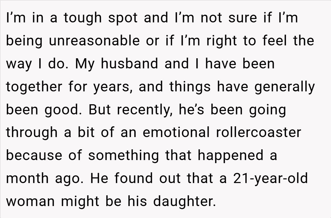 When unexpected family revelations surface, relationships can feel like they’re caught in a whirlwind of hope, fear, and uncertainty. In this story, a 35-year-old woman grapples with the fallout of her husband’s discovery that a 21-year-old woman claims to be his daughter—a claim that has turned his world upside down.