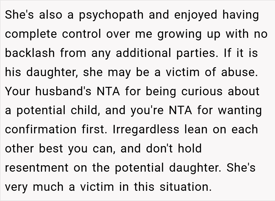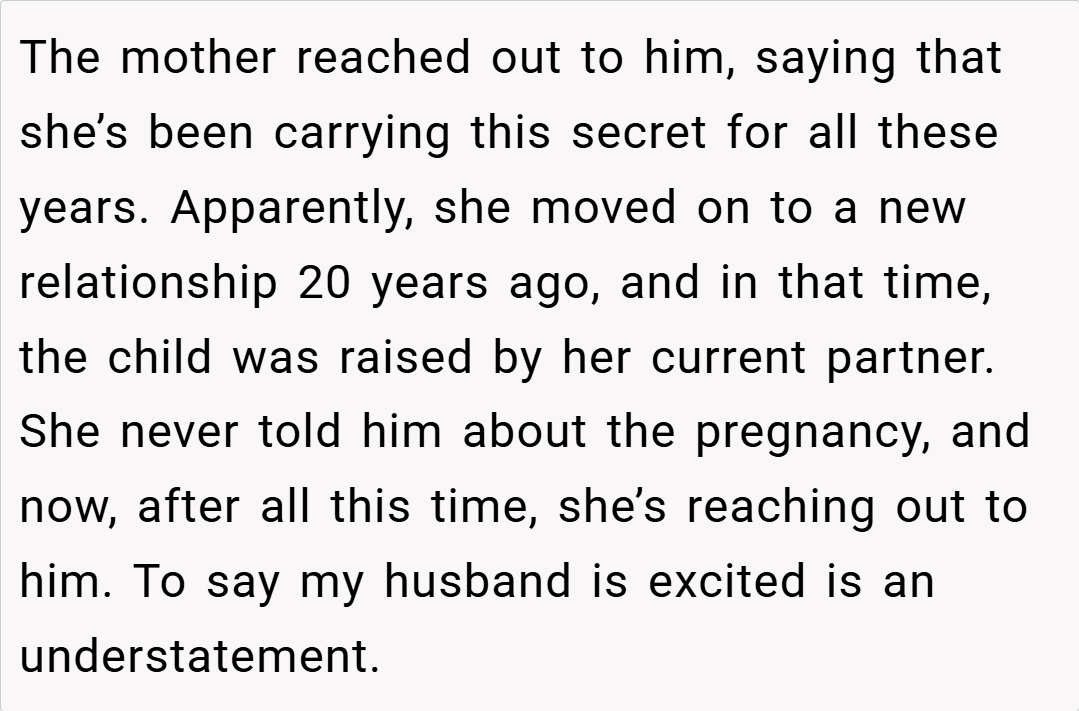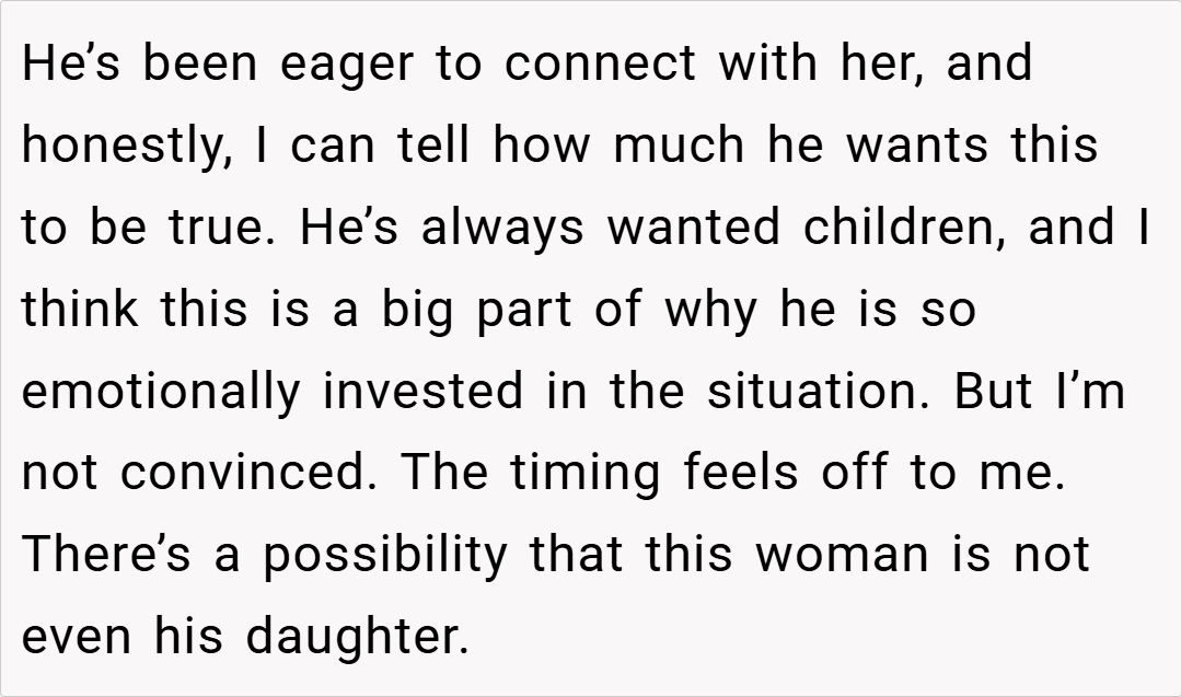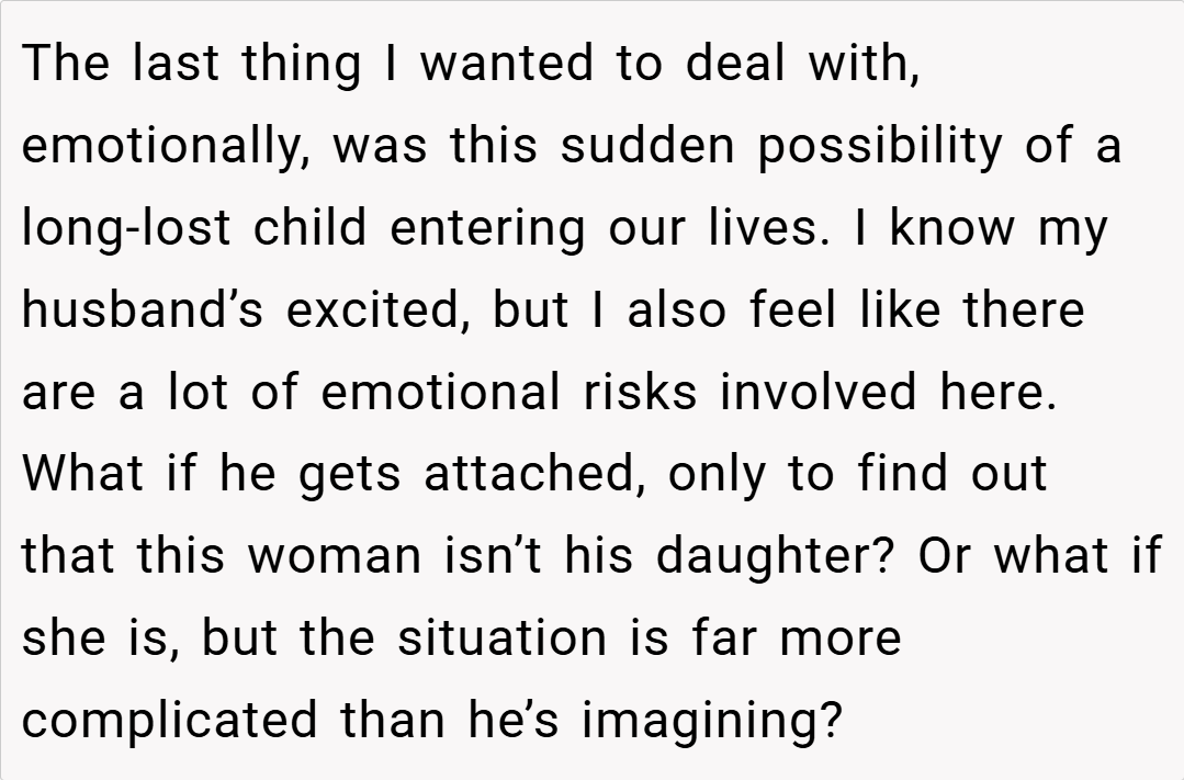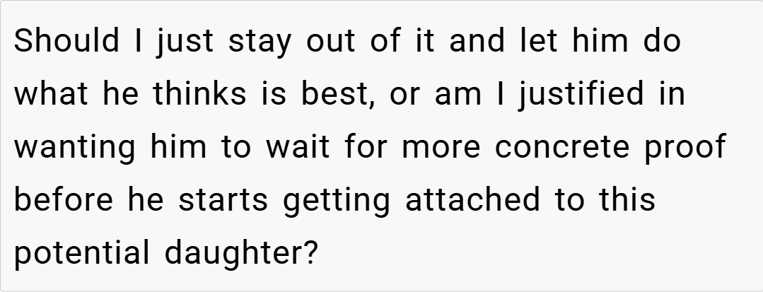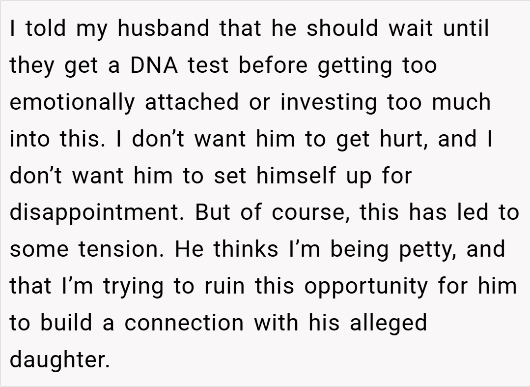 Ultimately, your insistence that your husband wait for a DNA test before forming a deeper emotional connection with his alleged daughter is not an act of pessimism—it’s a cautious, protective measure. While his lifelong dream of having children makes his excitement understandable, the risks of attaching yourself to a possibility that might not be real can lead to significant emotional fallout. Balancing hope with practical verification is crucial, especially when your future and well-being are on the line.