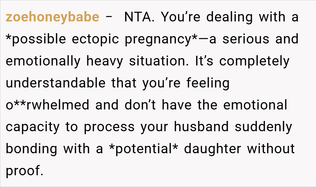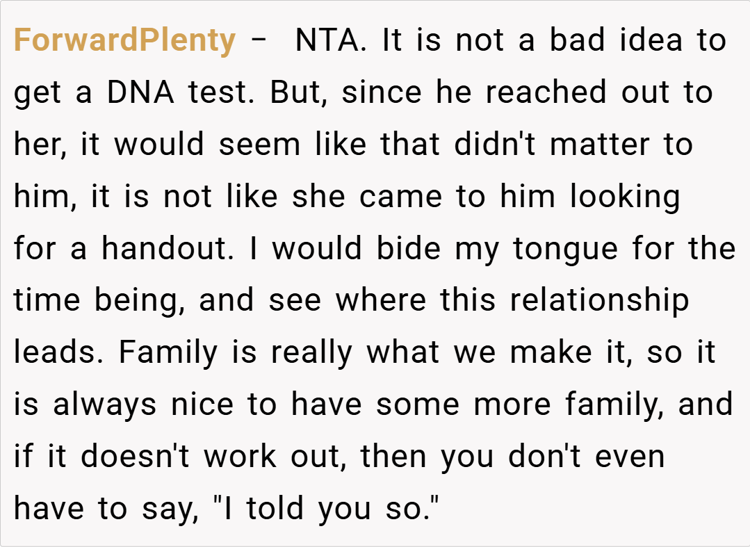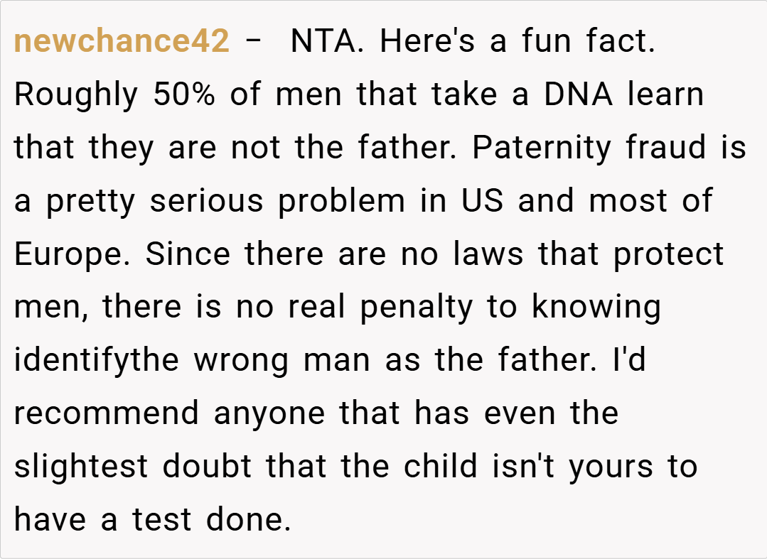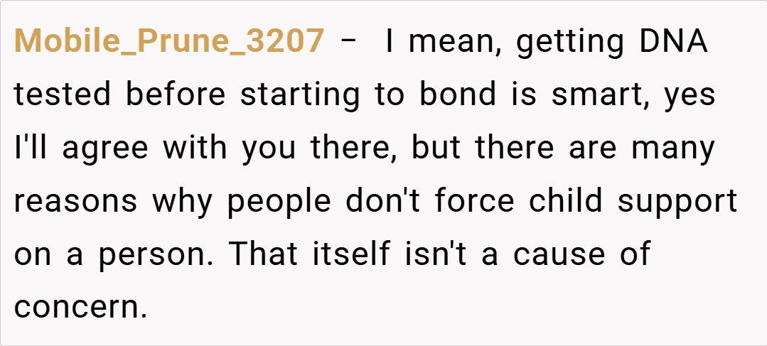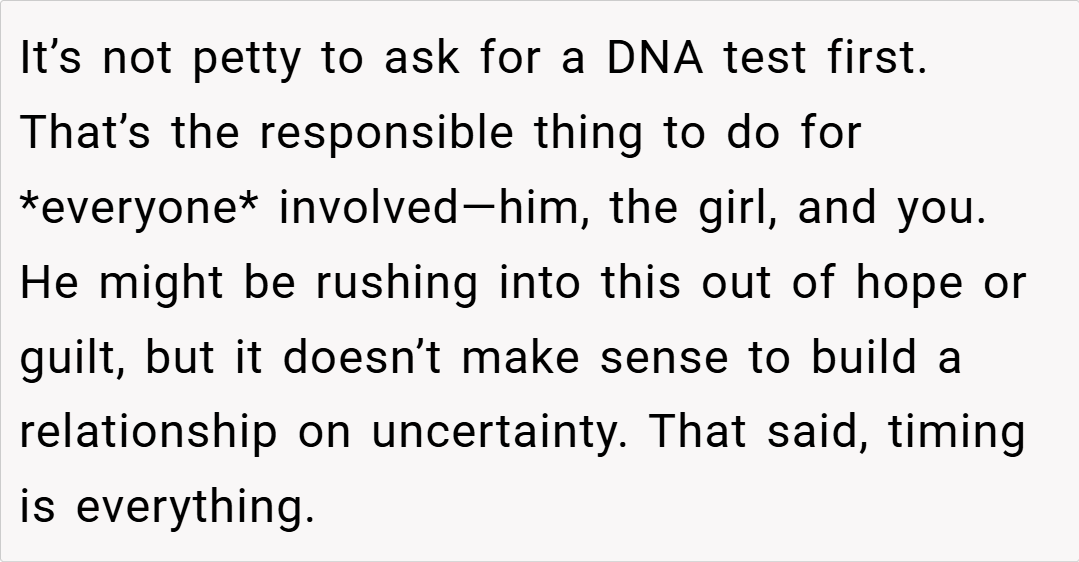 Several redditors expressed support for her decision. One user commented, “Waiting for a DNA test is completely reasonable when your partner’s emotions and your family’s future are at stake. It’s about ensuring that you’re both building on a solid foundation, not just chasing a hopeful possibility.”