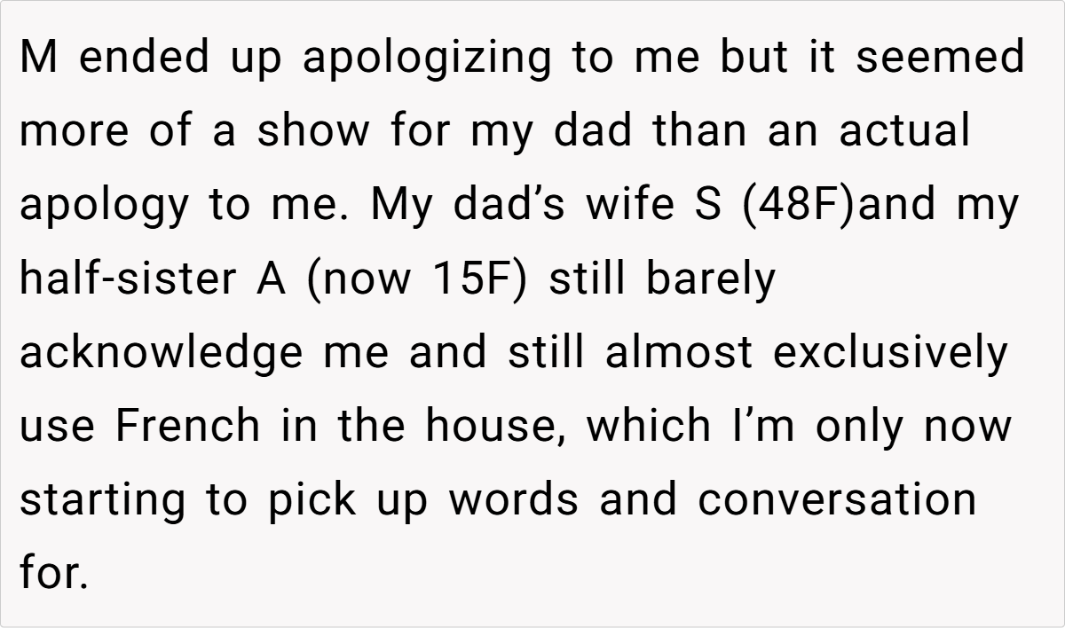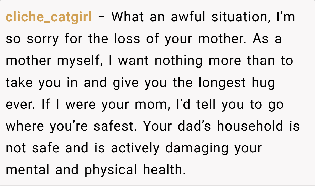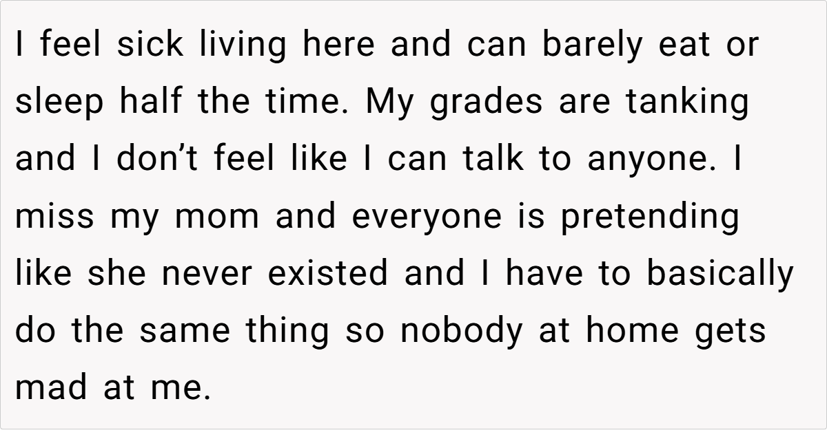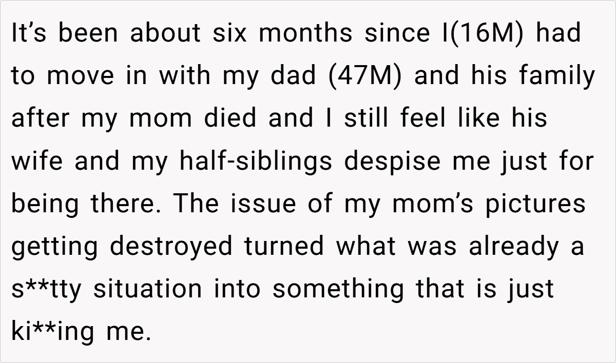 In the following scenario, a teenage son faces psychological struggles after moving in with his father, stepmother, and half-siblings under tense circumstances. His mother’s passing and the subsequent conflicts with relatives push him to question how to cope with everything. That quandary fuels the account below, presenting a candid view of a delicate household and an uneasy path ahead.