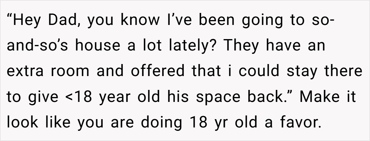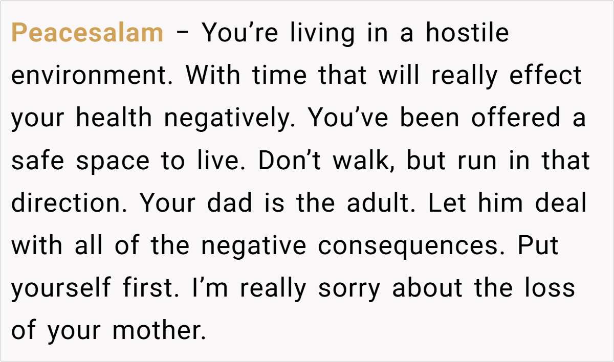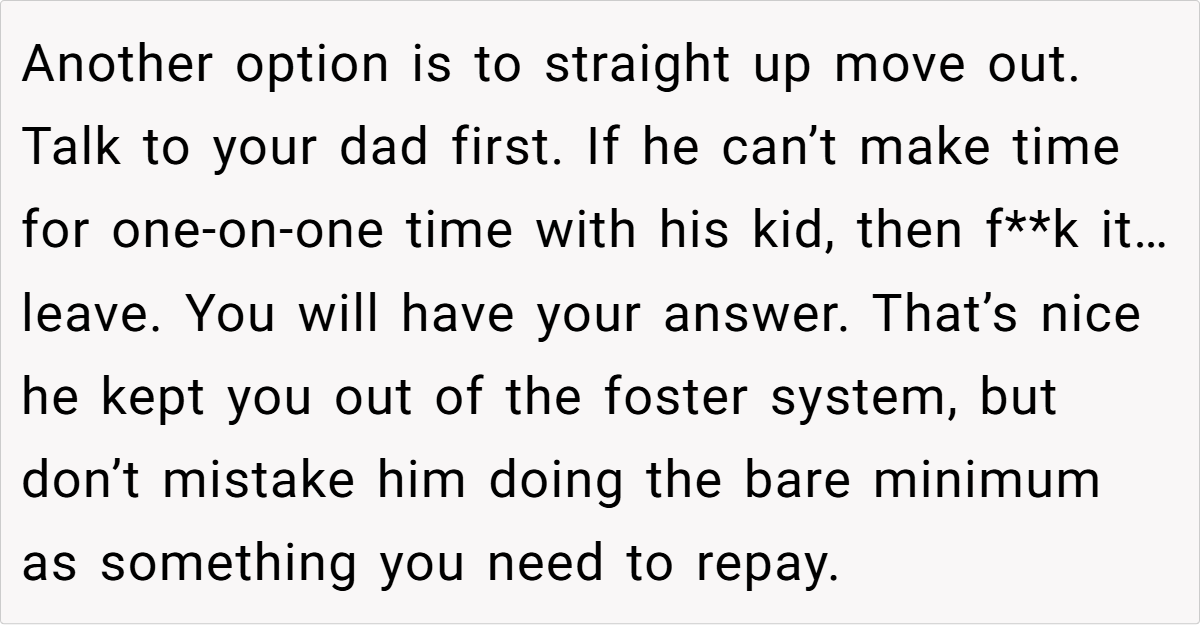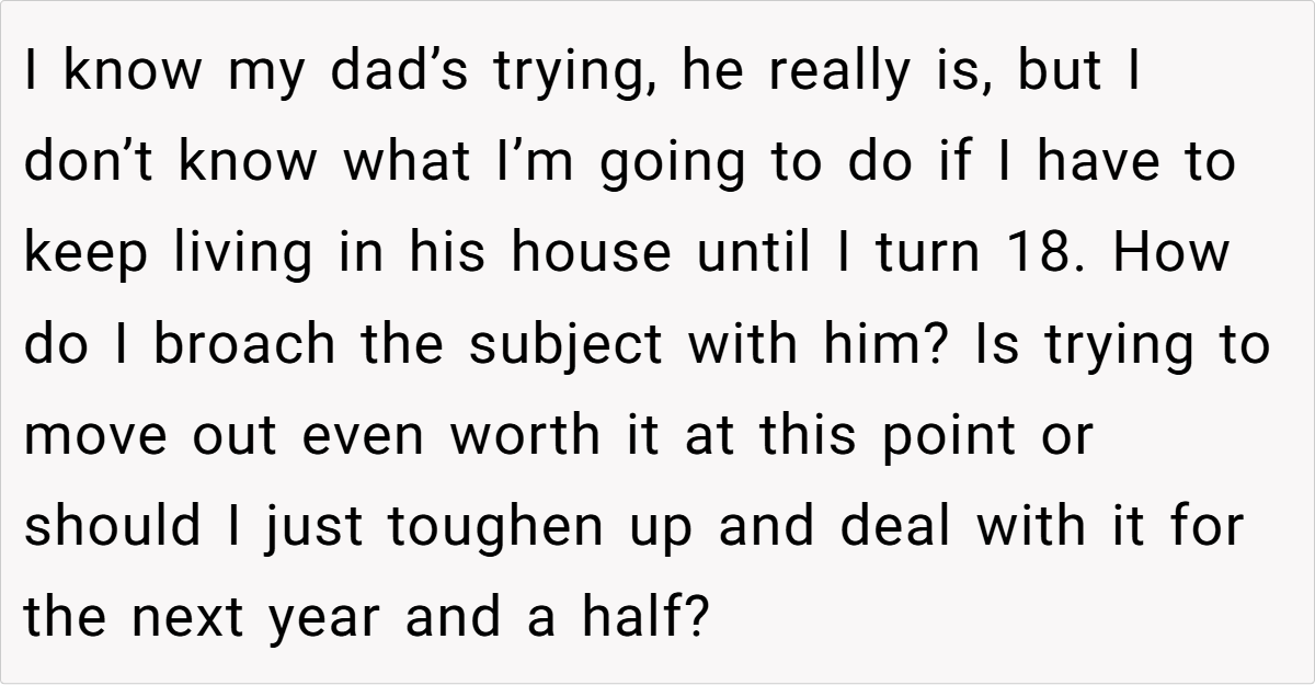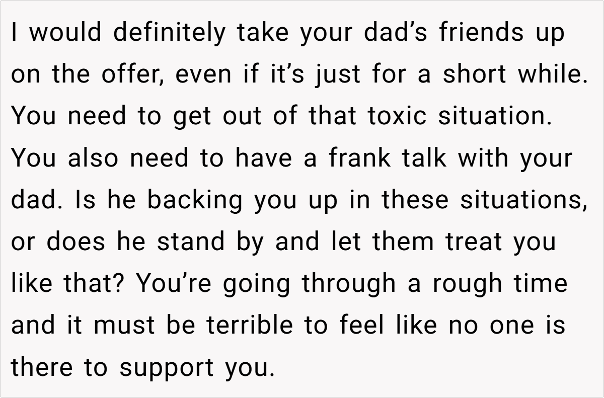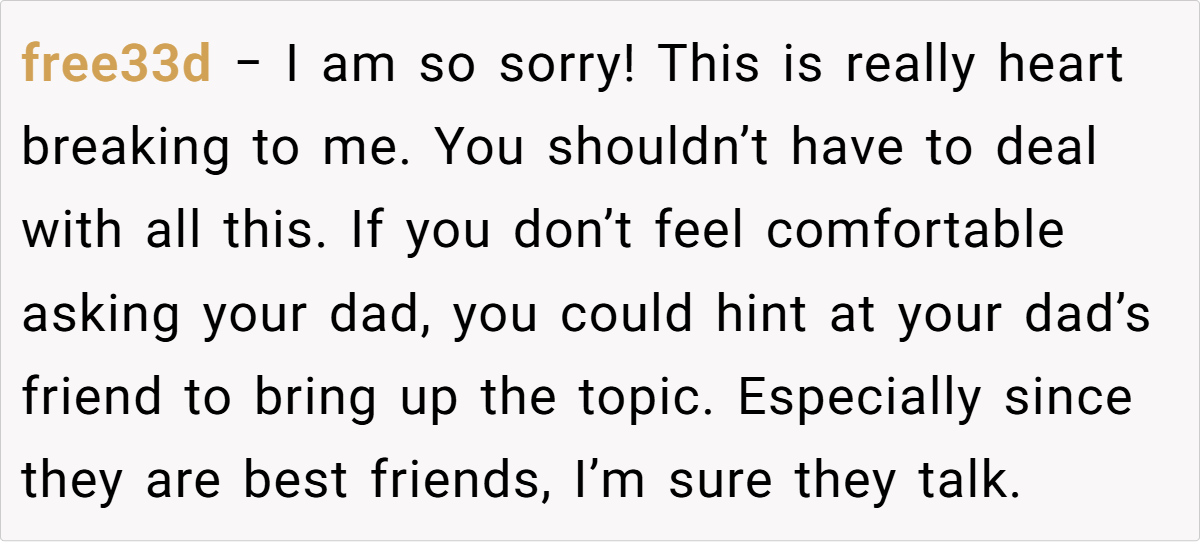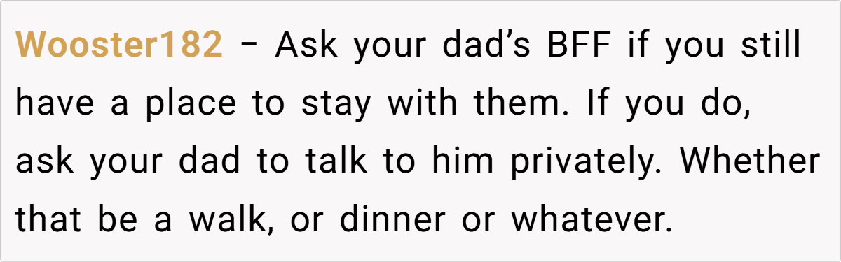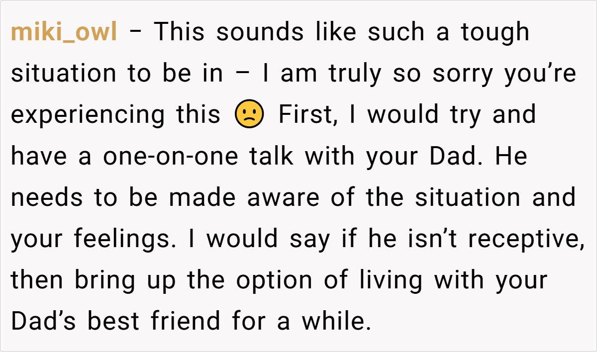 A quick overview of the top reactions suggests that most commenters sympathize with the teenager’s predicament. Many encourage him to accept the offer to move in with his dad’s best friend, insisting that no one should endure a harsh household. Others emphasize that the father’s effort is admirable but insufficient if the toxic atmosphere remains. Several respondents propose open talks, therapy, or a transitional plan to avoid sudden conflict. This cluster of advice centers on preserving the teen’s mental well-being.