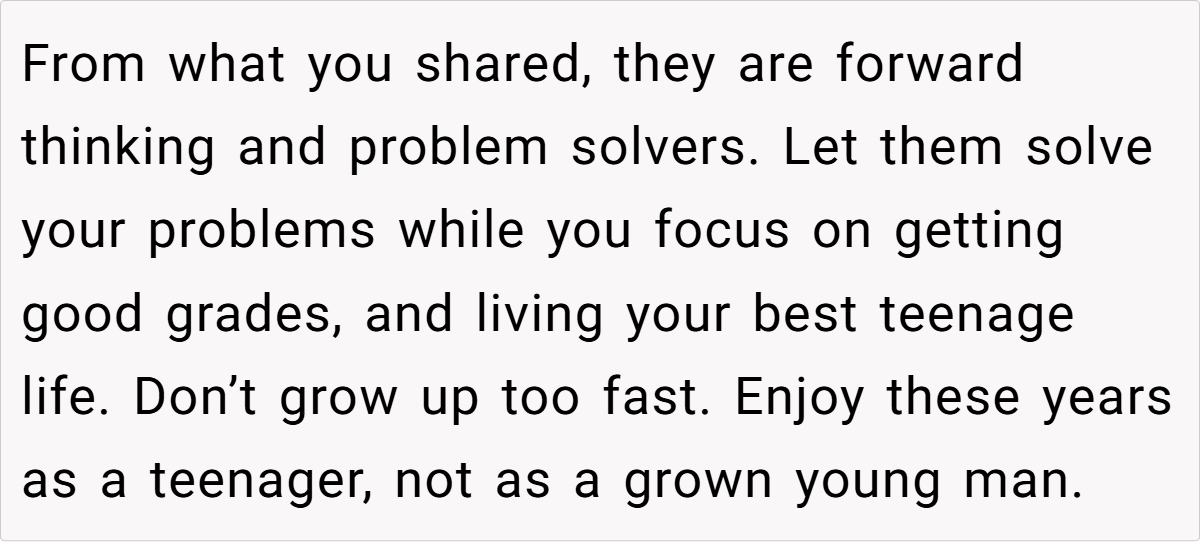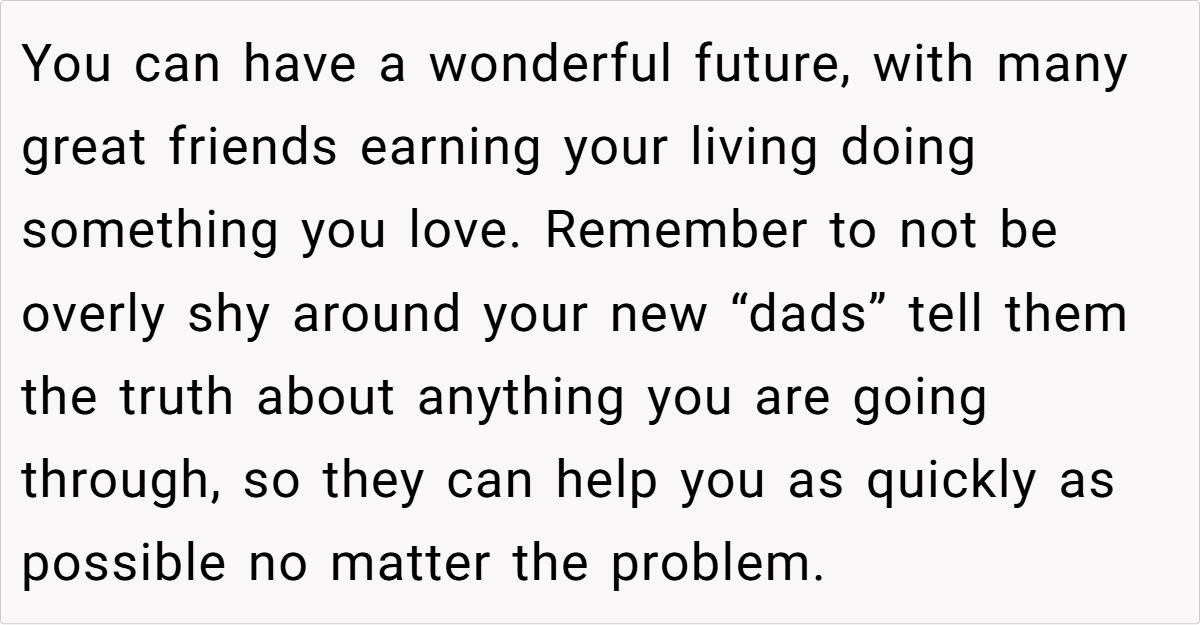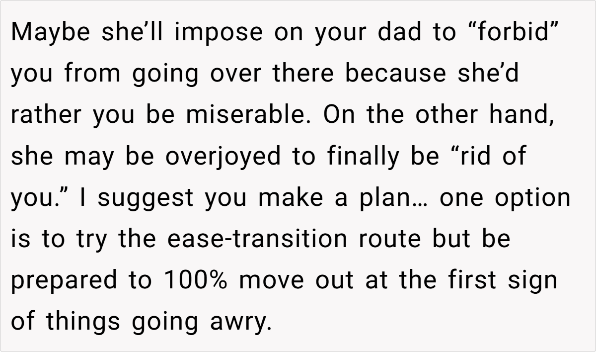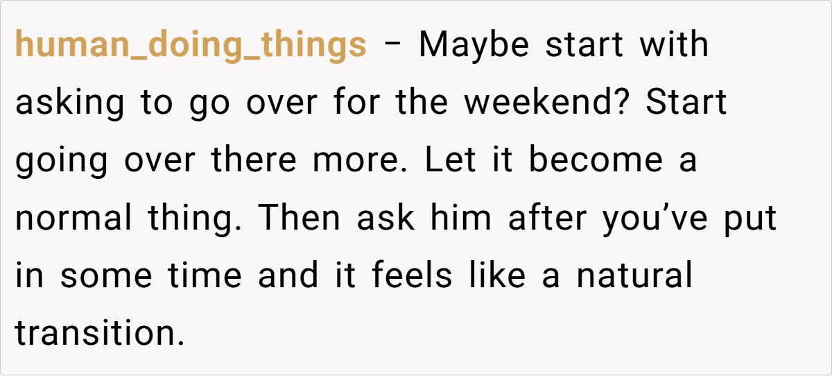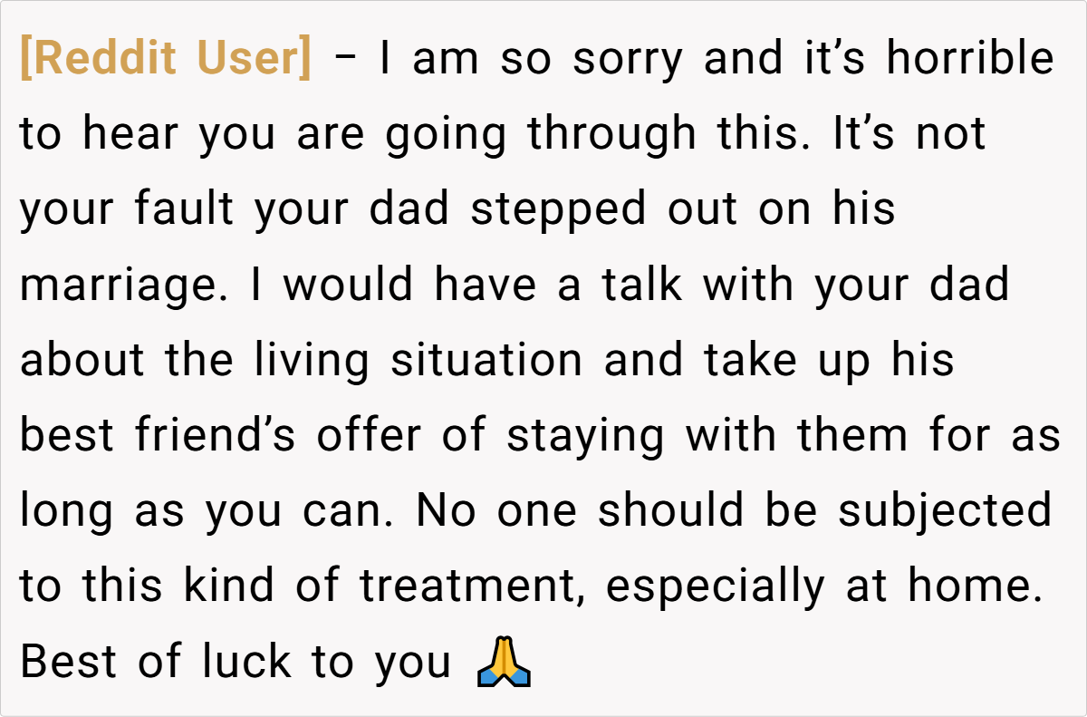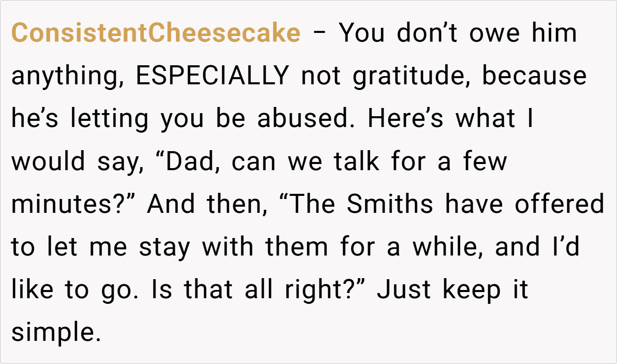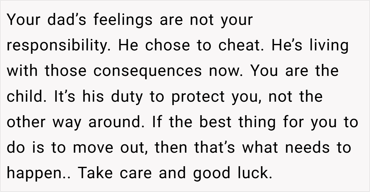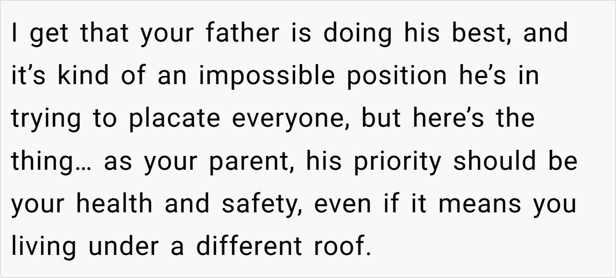 A quick overview of the top reactions suggests that most commenters sympathize with the teenager’s predicament. Many encourage him to accept the offer to move in with his dad’s best friend, insisting that no one should endure a harsh household. Others emphasize that the father’s effort is admirable but insufficient if the toxic atmosphere remains. Several respondents propose open talks, therapy, or a transitional plan to avoid sudden conflict. This cluster of advice centers on preserving the teen’s mental well-being.