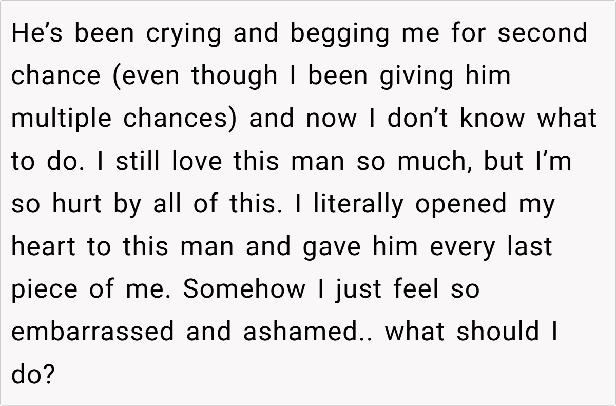 Many commenters empathize with her struggle, debating whether endless second chances can ever repair a fractured trust. Others quip that “love shouldn’t feel like a part-time detective job,” underscoring the absurdity of constantly uncovering hidden truths. These opinions, while diverse, remind us that even in our darkest moments, sharing the burden can spark new perspectives and healing insights.