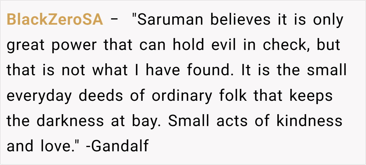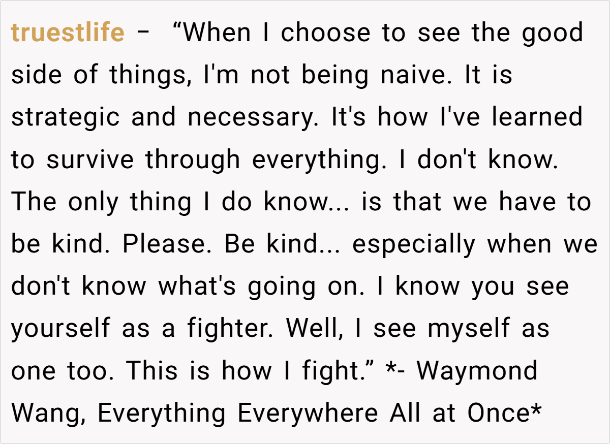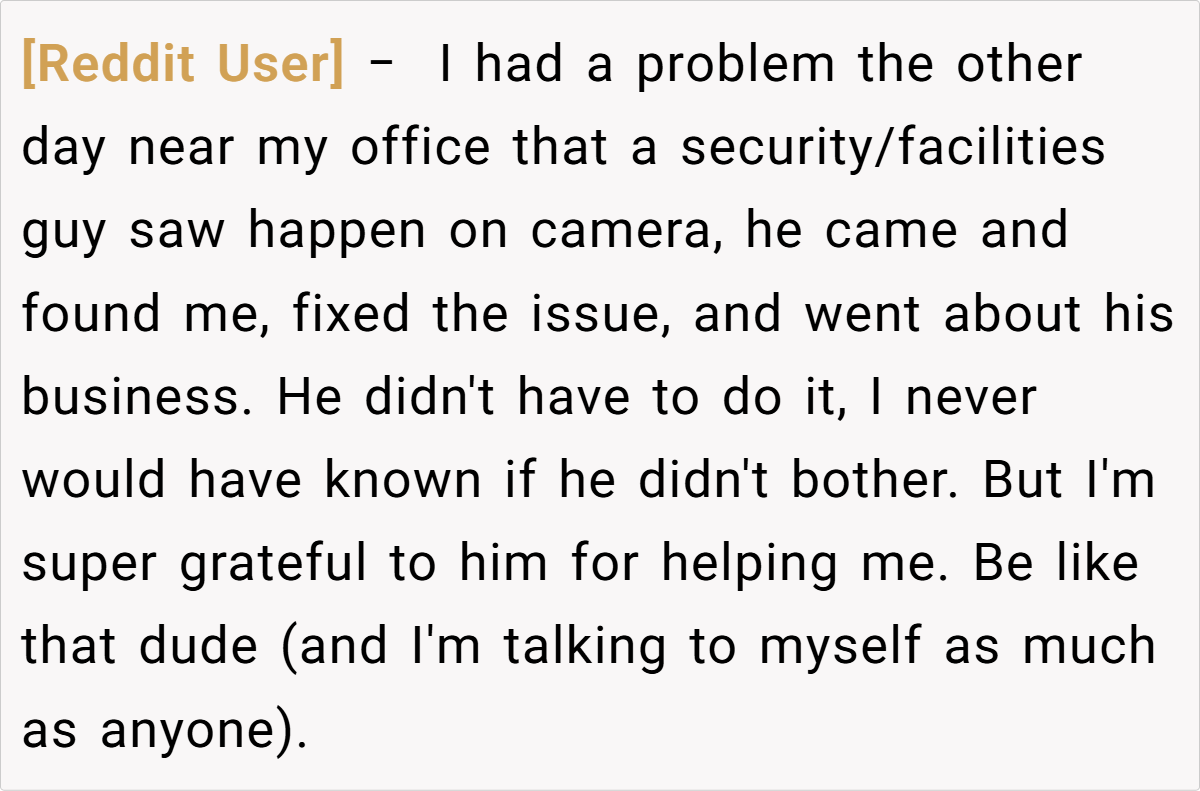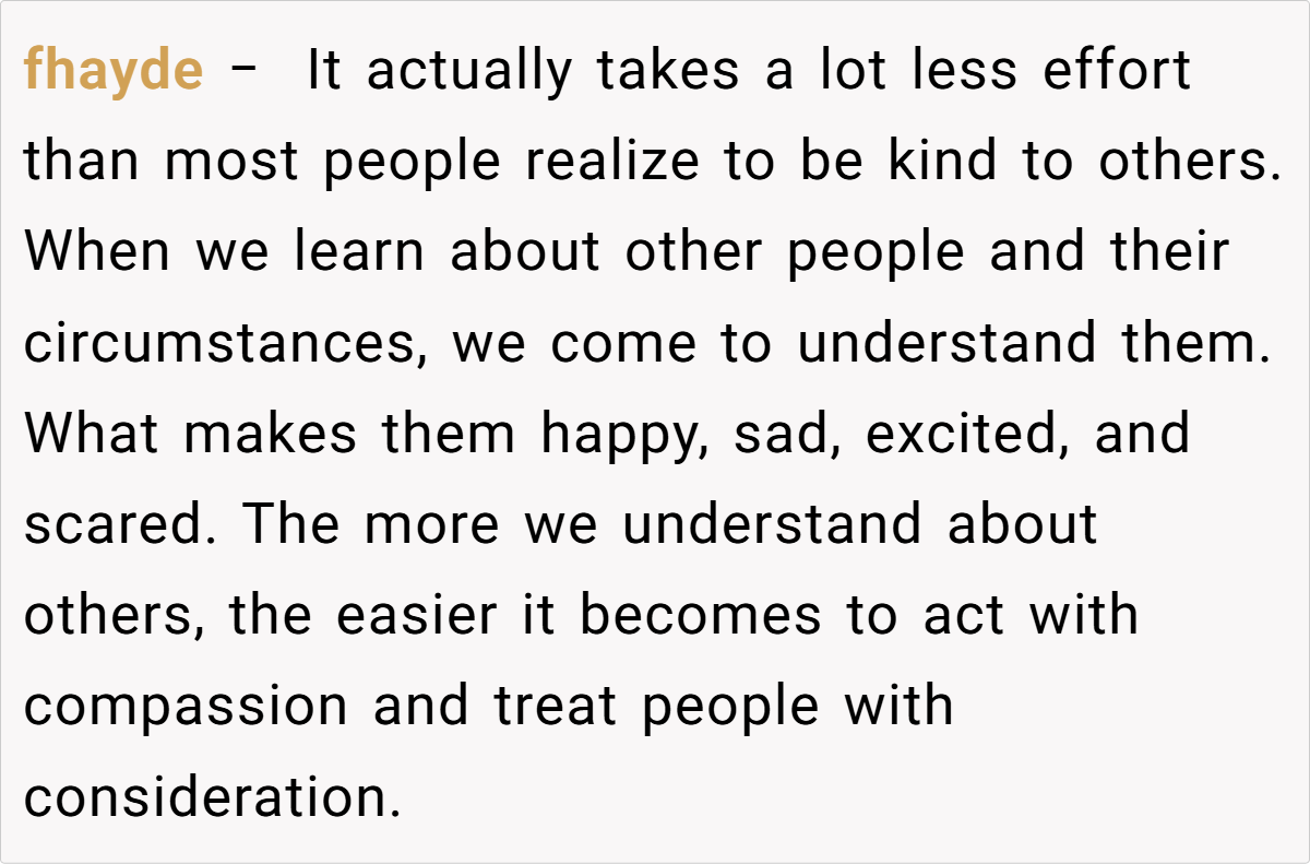 ‘LPT: It takes extreme strength and courage to be a consistently kind person in a world that rewards selfishness. Make sure to thank people who demonstrate kindness. They are choosing the hard, selfless route in order to make the world a better place for everyone.’
