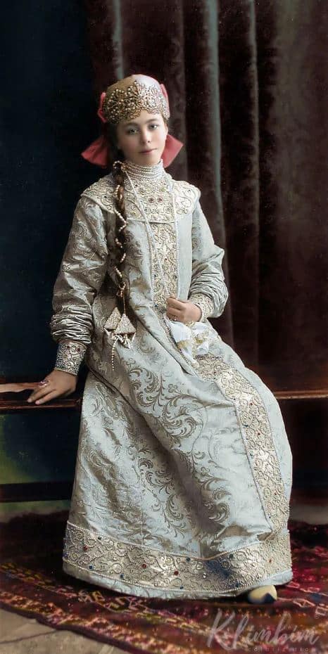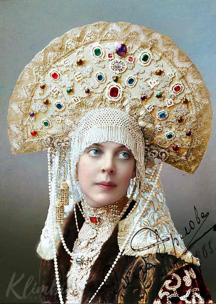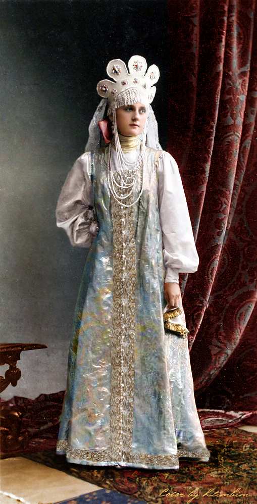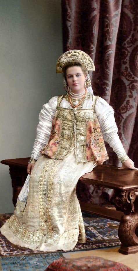 Grand Duke Alexander Mikhailovich, her husband, wrote about the dress: “Ksenia was dressed as a boyar’s wife, her costume was richly decorated and sparkling with jewels that suited her well.”