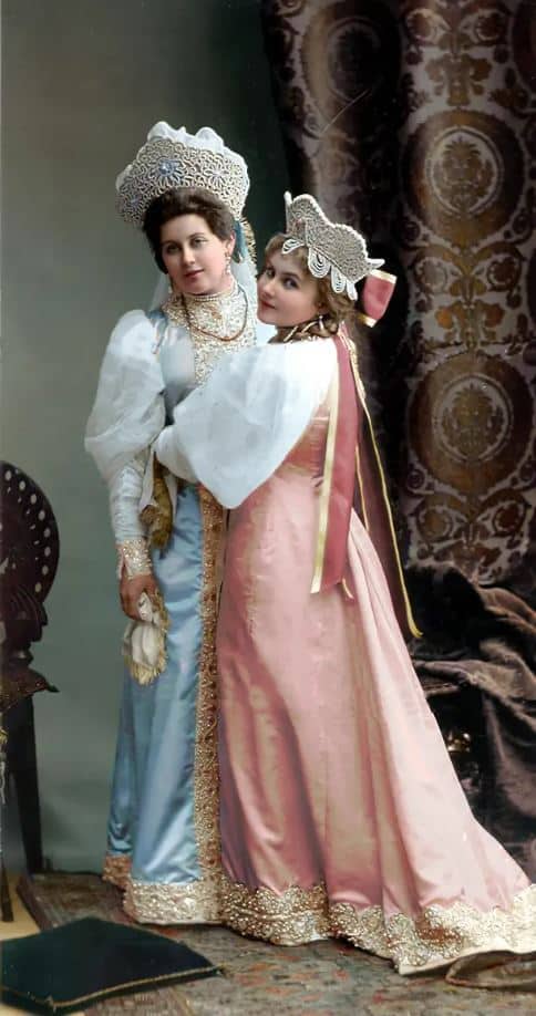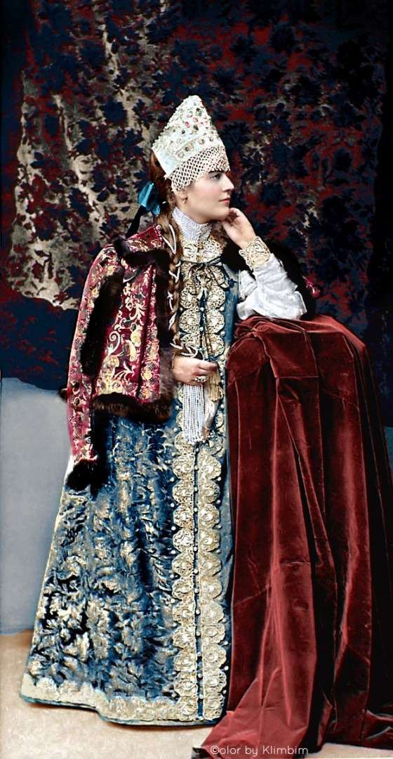 Boyars were the highest-ranking members of the Russian aristocracy before the rise of the Romanovs, and their attire was richly decorated with luxurious fabrics, embroidery, and lavish jewelry. Elisabeth’s costume reflected this opulence and symbolized her noble lineage.