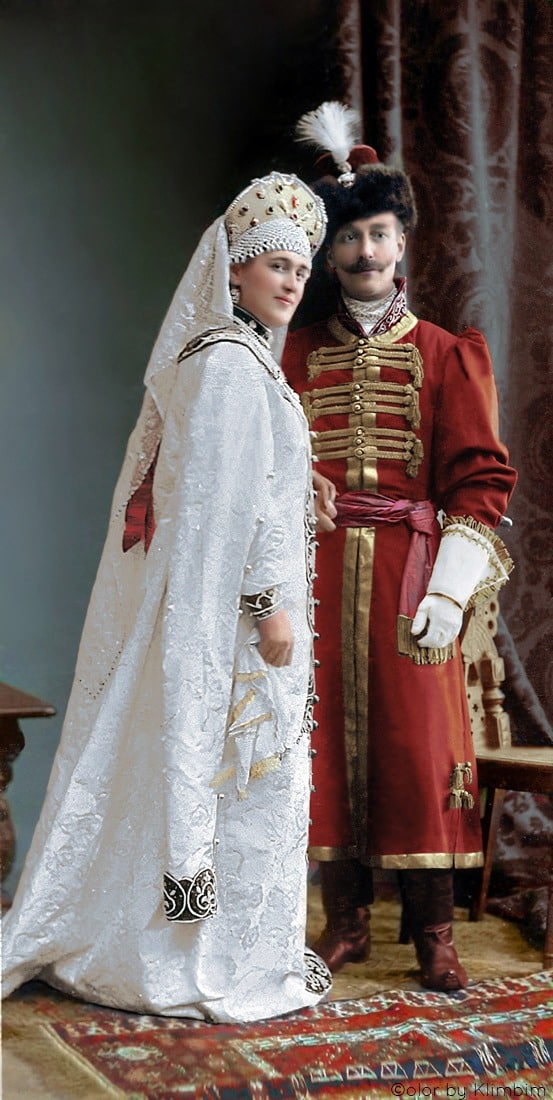 Guards Captain N.N. Mansurov and his wife M.A. Mansurova dressed in splendid outfits inspired by the times of Tsar Alexei Mikhailovich.