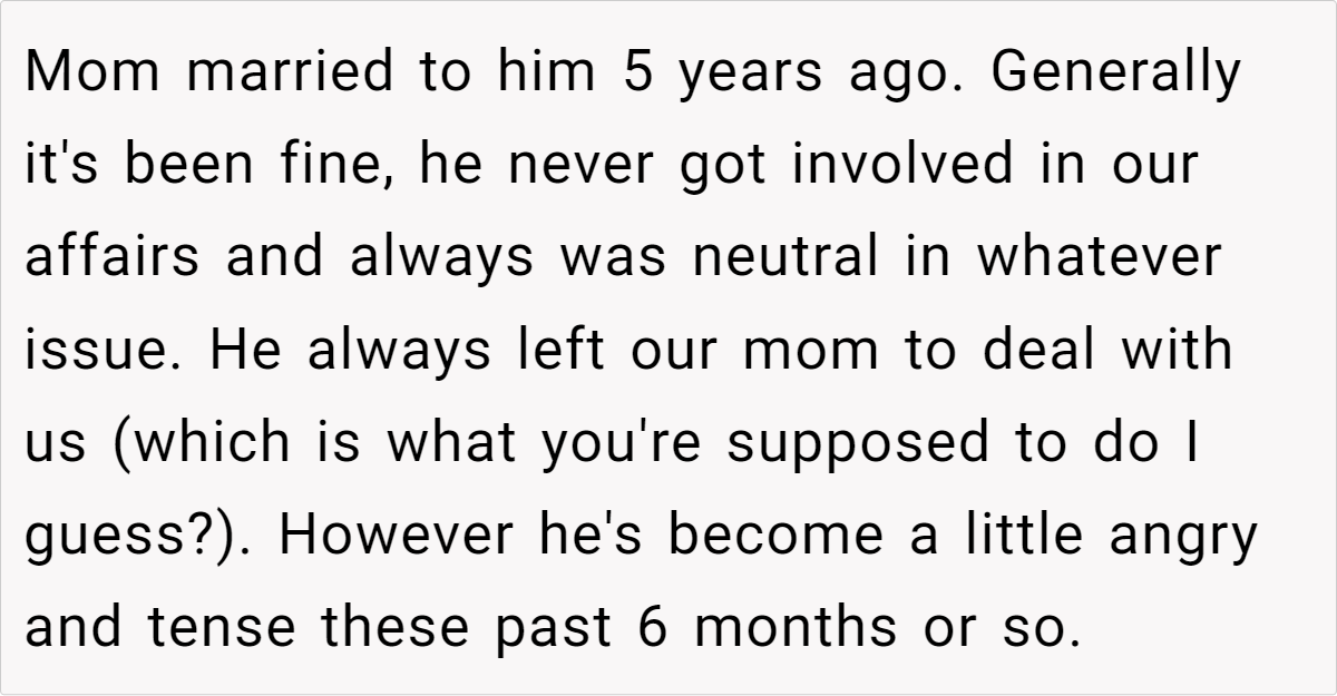 Letting your partner meet your family can feel like a monumental step in a relationship. In this case, however, the introduction of a new figure into an already delicate family dynamic has taken a troubling turn. The stepfather’s sudden physical outburst after months of underlying tension reveals a deeper, unresolved conflict that goes far beyond a single act. His unexpected aggression not only shocked the siblings but also exposed a rift between parental authority and protective instincts.