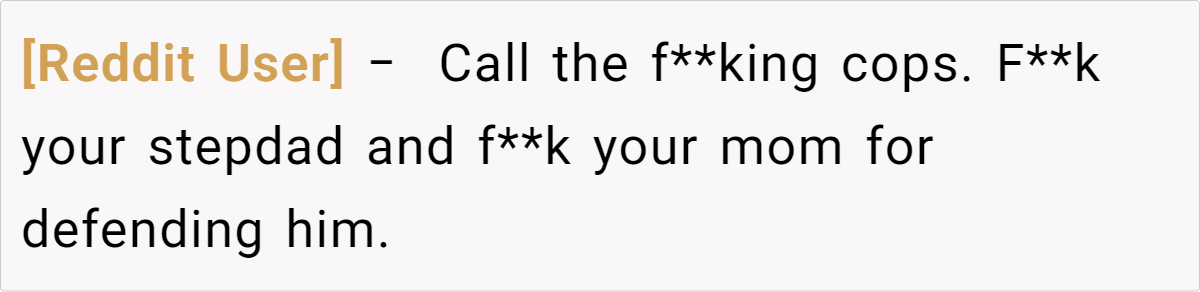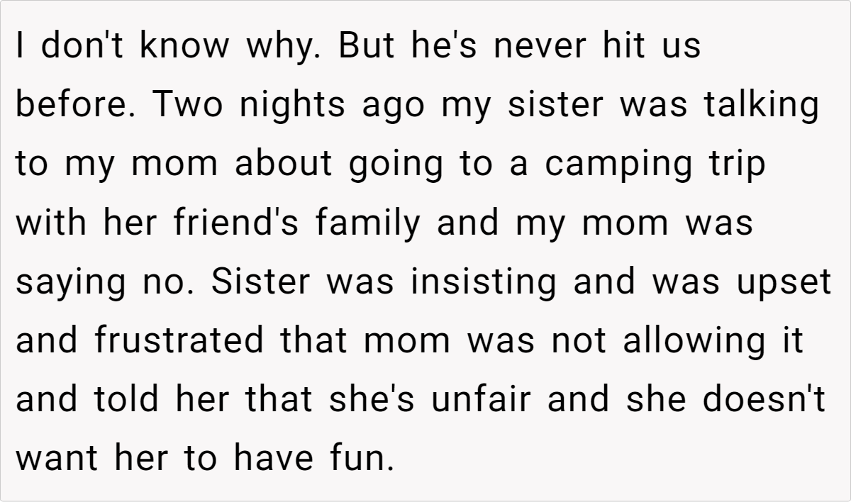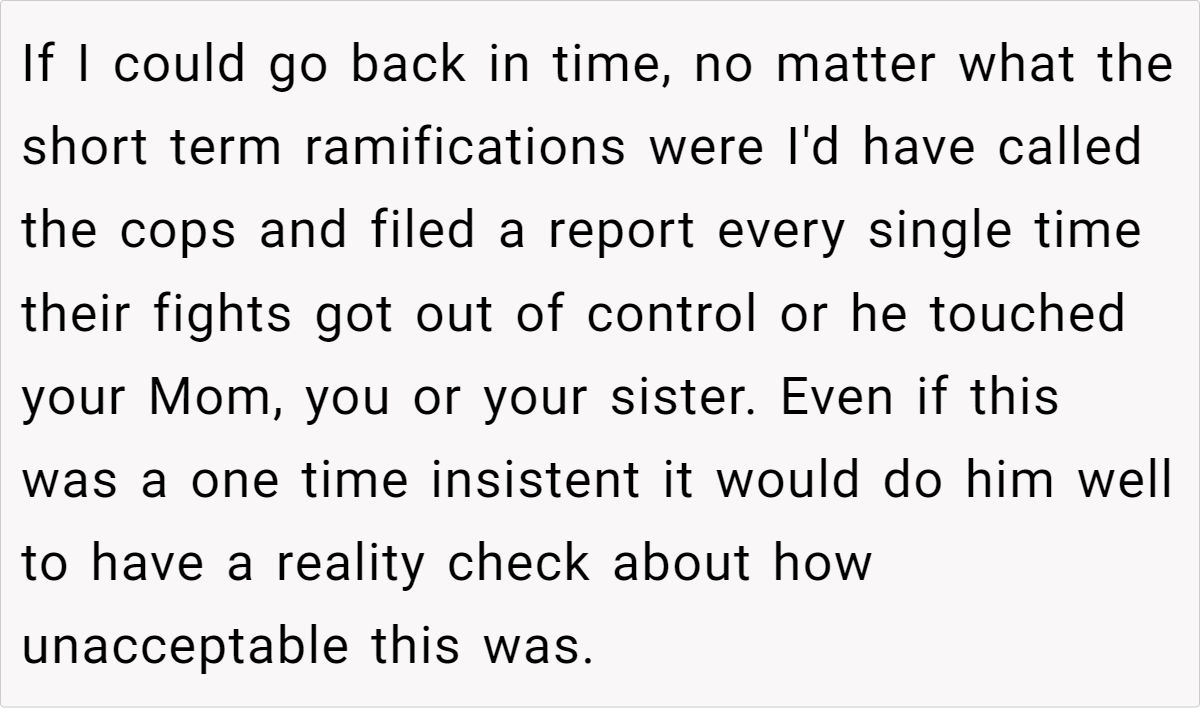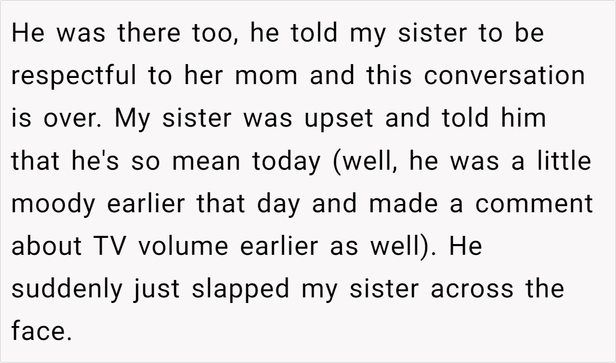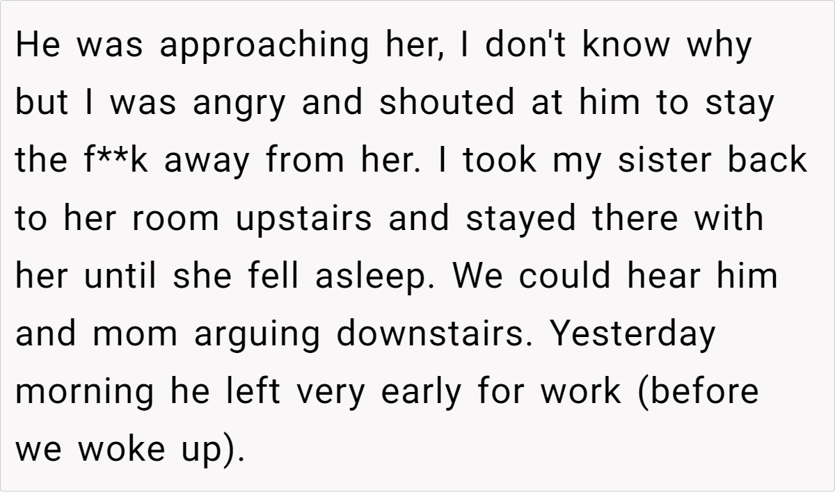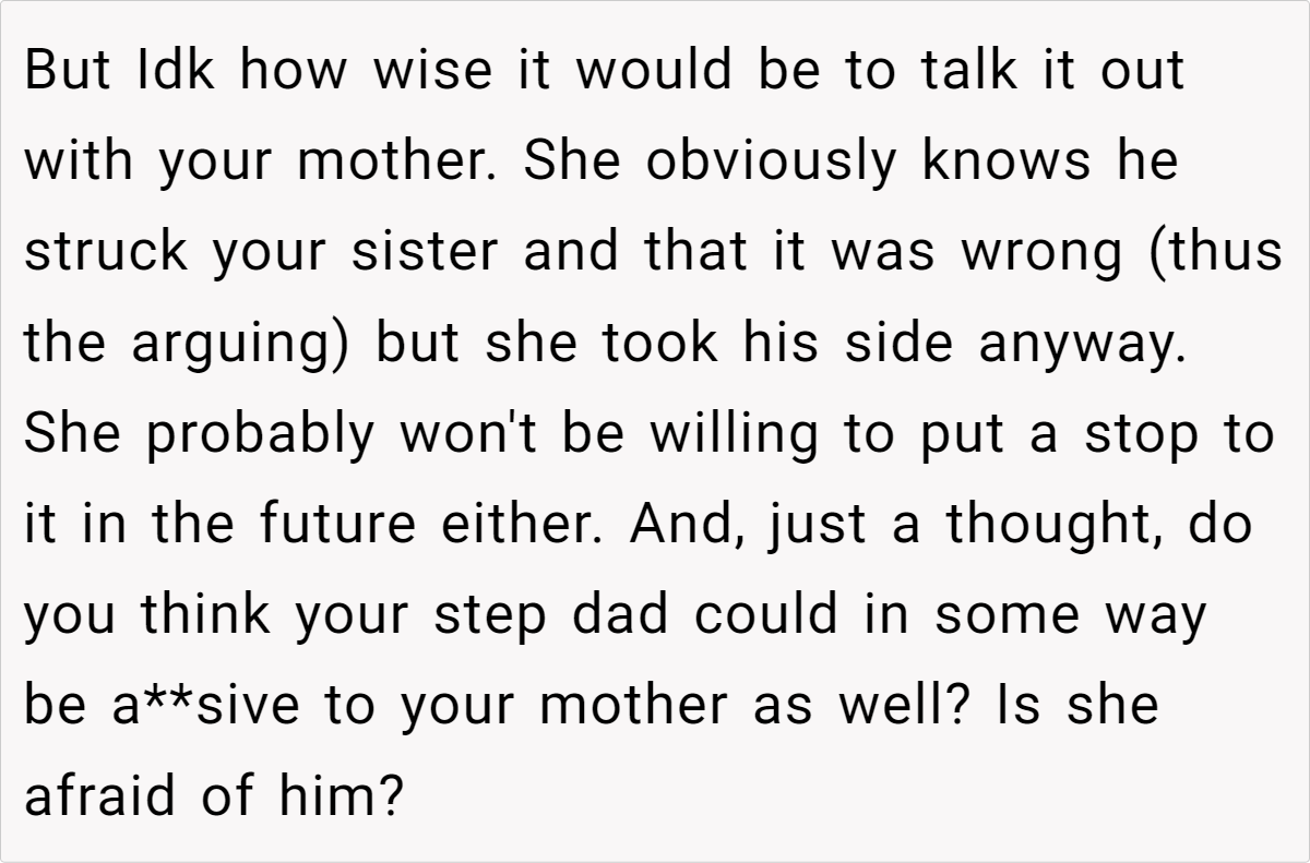 A protective elder sibling finds himself caught between loyalty and outrage when a long-troubled stepfather crosses the line. With emotions running high and a mother caught in the crossfire, the incident forces us to examine where family discipline ends and abuse begins. The vivid details of this confrontation remind us that sometimes, standing up for those we love comes with significant personal risks.