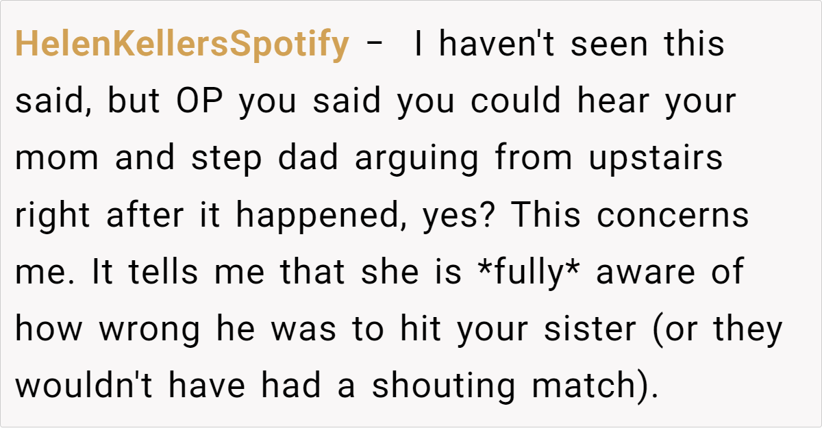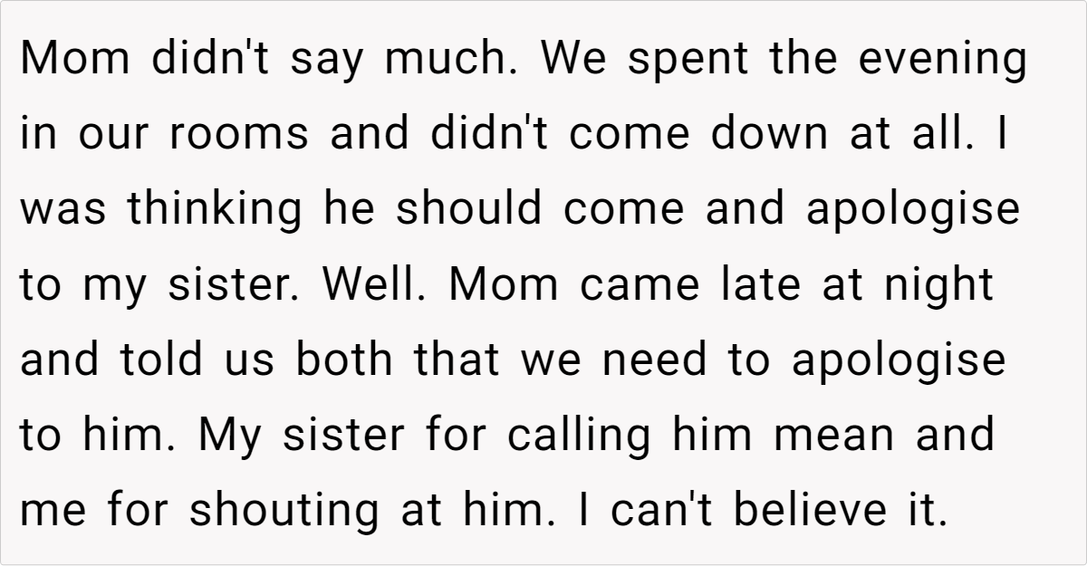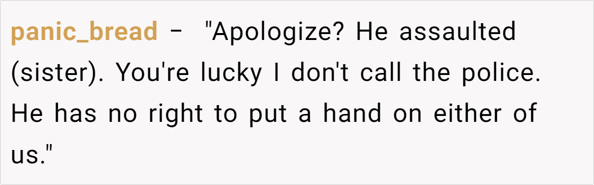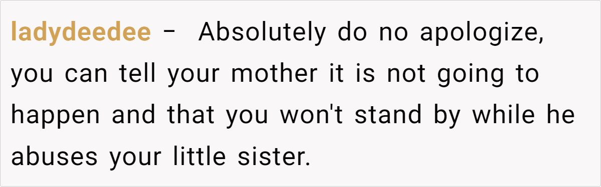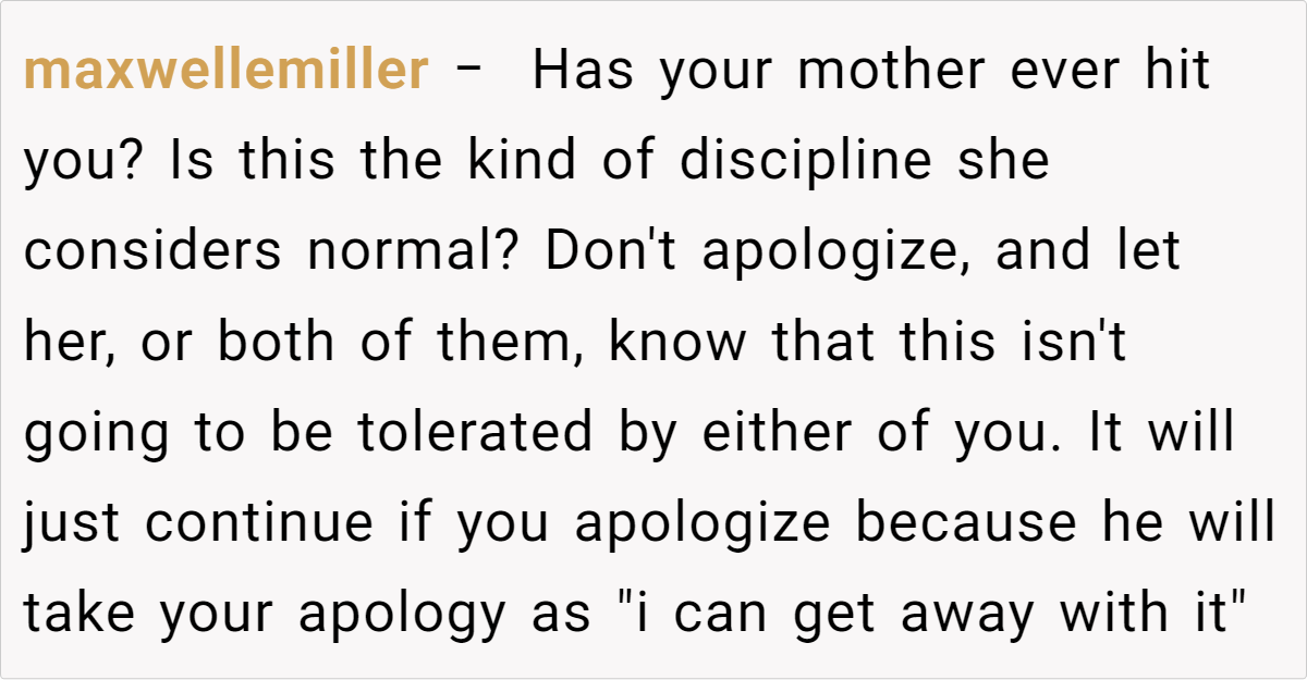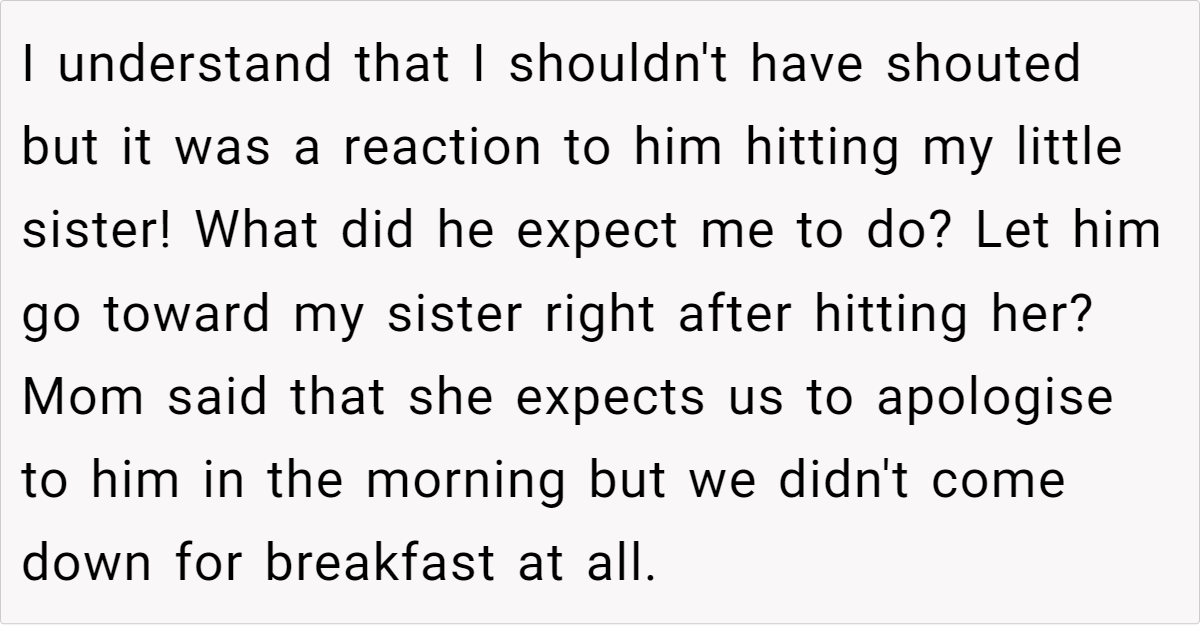 The protective sibling’s reaction—shouting in defense of his younger sister—underscores the emotional intensity of the moment. His response, though impulsive, speaks to the primal need to shield loved ones from harm. Meanwhile, the mother’s insistence on an apology, despite clear evidence of wrongdoing, suggests a problematic dynamic where maintaining peace takes precedence over addressing abuse. This conflicting approach highlights the complexities of blended families, where loyalties can be divided and emotional safety is at risk.