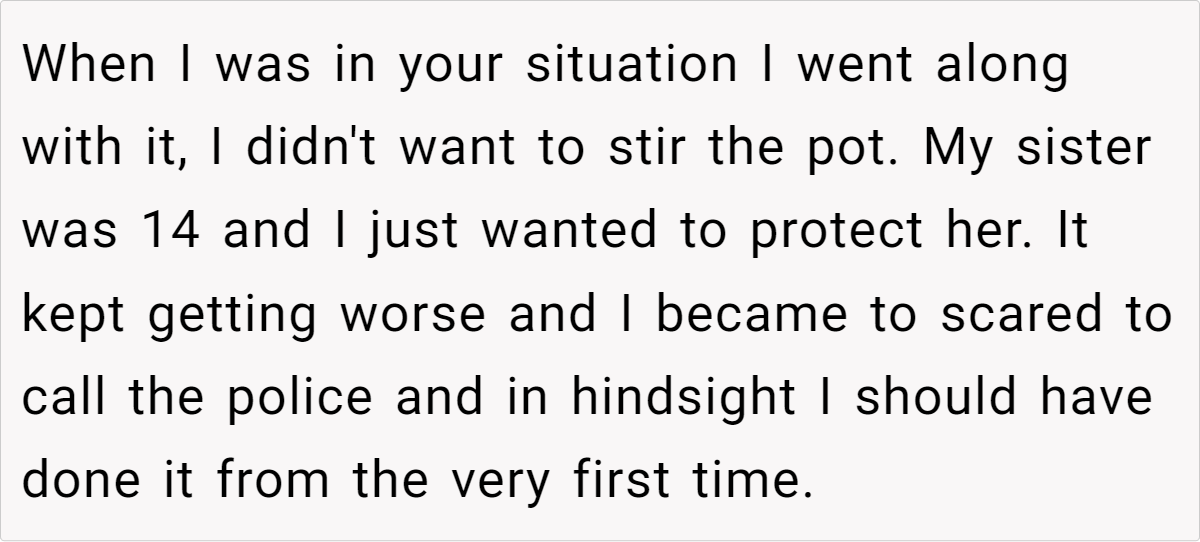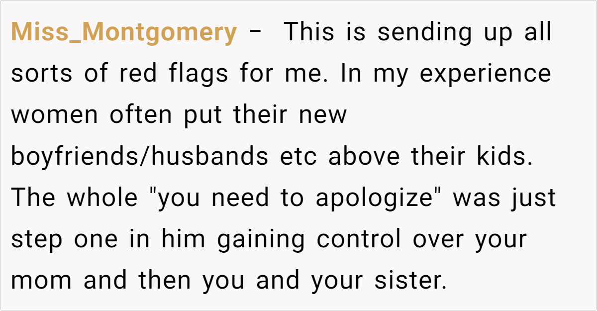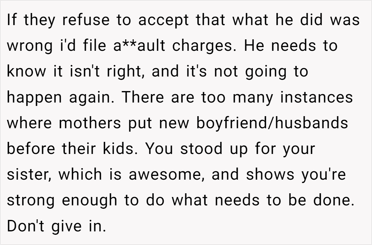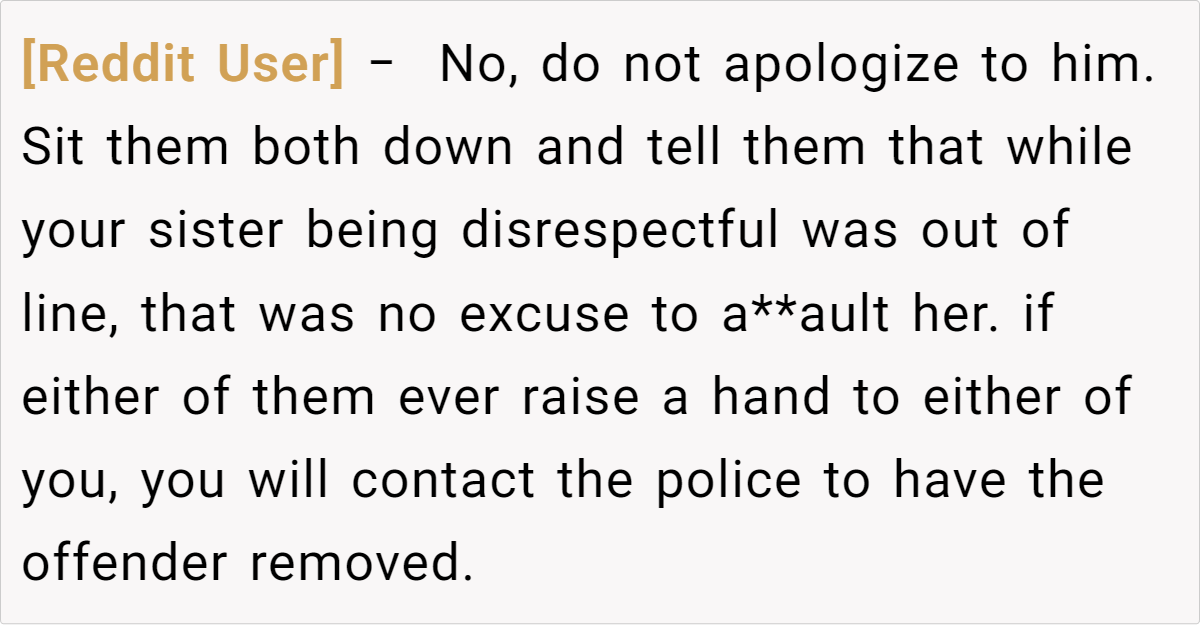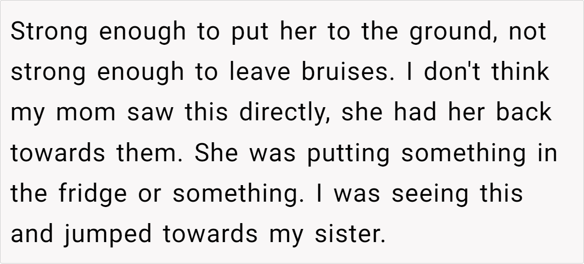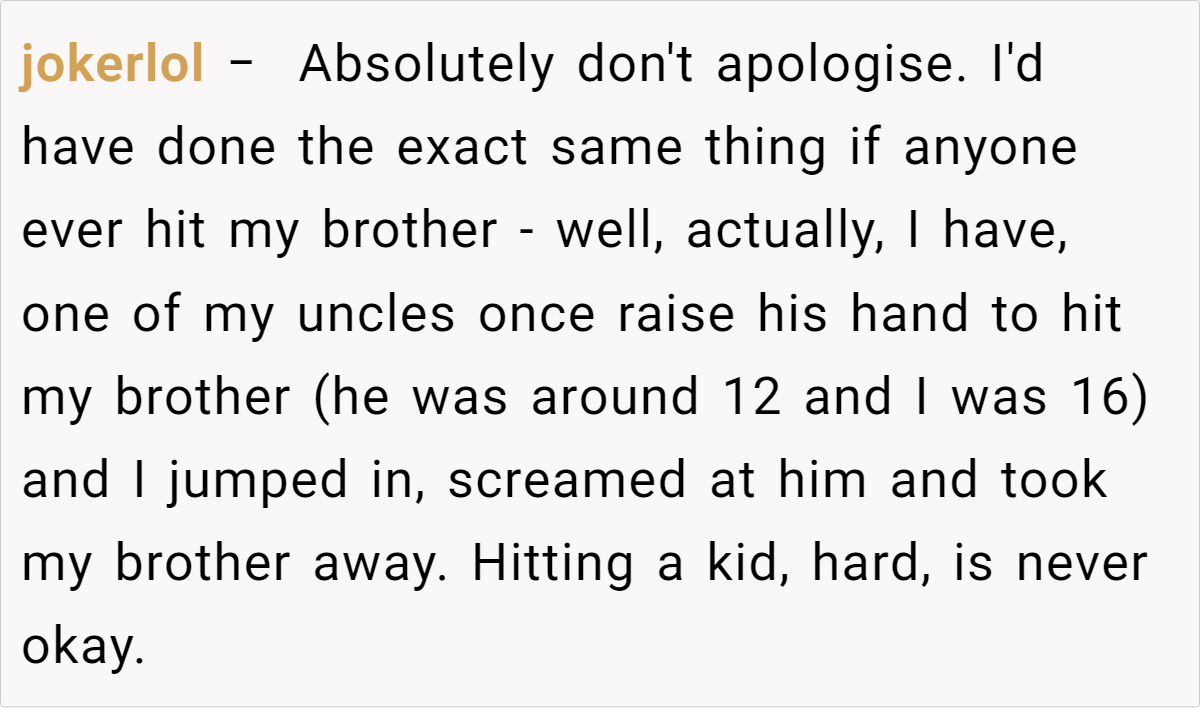 The protective sibling’s reaction—shouting in defense of his younger sister—underscores the emotional intensity of the moment. His response, though impulsive, speaks to the primal need to shield loved ones from harm. Meanwhile, the mother’s insistence on an apology, despite clear evidence of wrongdoing, suggests a problematic dynamic where maintaining peace takes precedence over addressing abuse. This conflicting approach highlights the complexities of blended families, where loyalties can be divided and emotional safety is at risk.