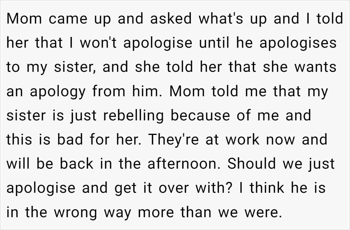 ‘ Step-father [44M] slapped my sister [14F] across the face and I [16M] shouted at him. Now mom [42F] wants us to apologise to him.’