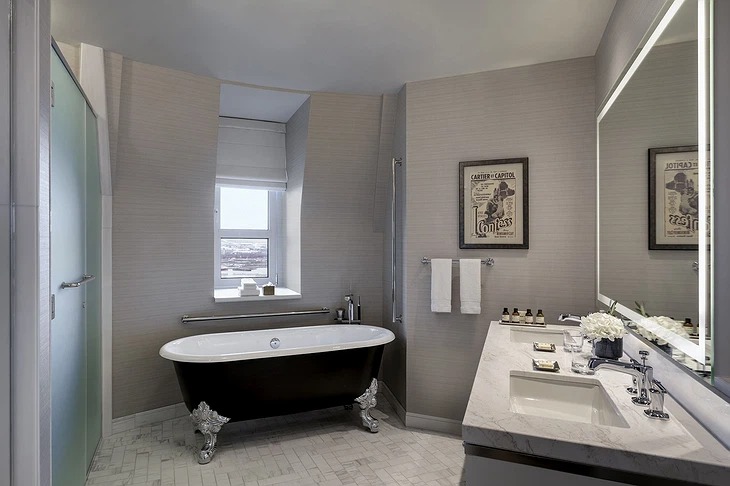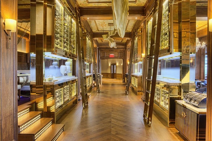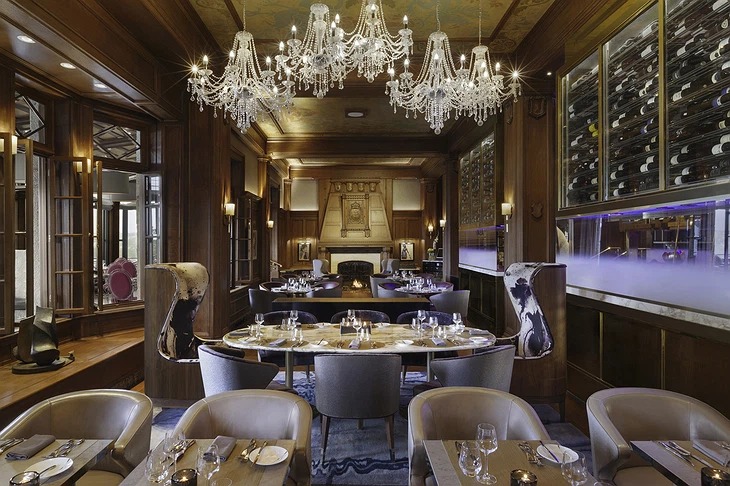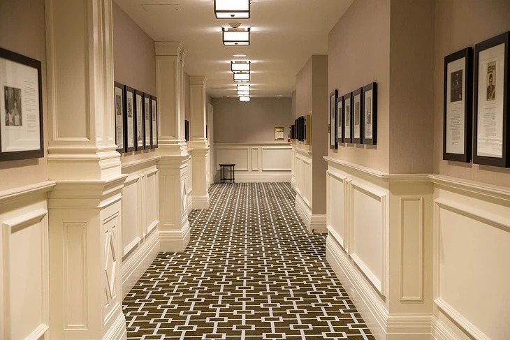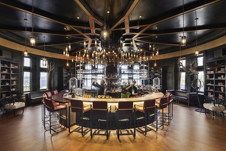 Inside, guests are greeted with luxurious materials including mahogany paneling, marble staircases, carved stone, wrought iron, and glass roundels.