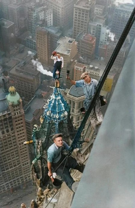 This black-and-white photograph stands as a powerful testament to the bravery of these workers. It shows men casually perched high above the city, painting the building’s intricate facade.