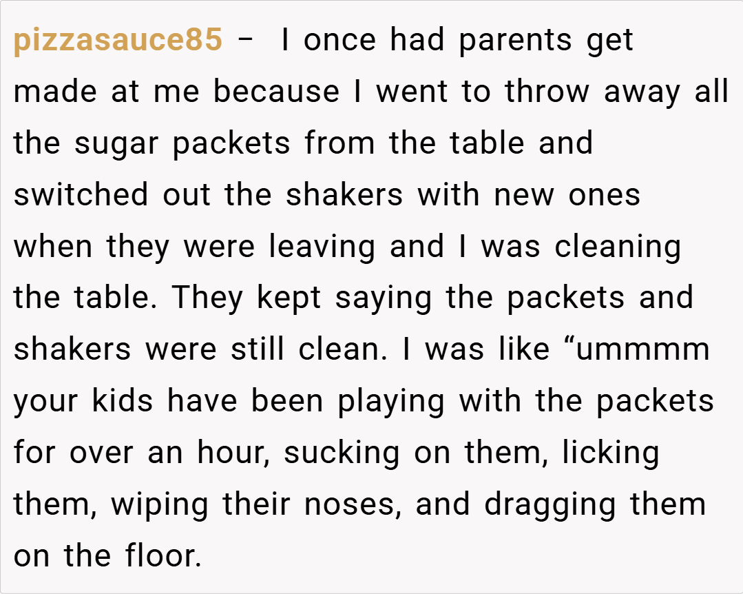 a public health professor at Columbia University. “This allows trained staff to handle the situation professionally while maintaining everyone’s dignity.” The numbers tell a sobering story about public food safety. According to the CDC, condiment stations can harbor up to 2,000 bacteria per square inch, making proper sanitization crucial. But the social dynamics at play are equally important. When parents feel their parenting is being questioned, defensive reactions are natural and can escalate situations quickly.